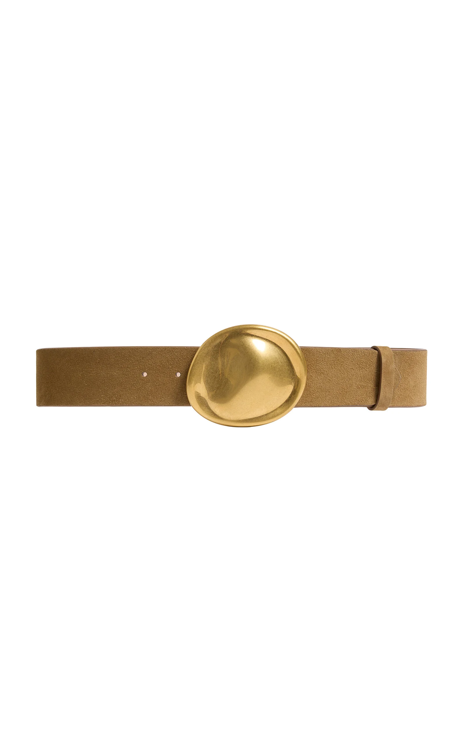 For Spring '26, Cate Holstein delivers pure New York City energy in a multitude of expressions that coalesce into a singularly fluid wardrobe. Made in Italy from cashmere suede, the 'Keefe' belt is defined by its sculptural buckle in antiqued gold. PRODUCT DETAILS - Buckle fastening - Composition: Cashmere Suede - Designer color: Mud - Made in Italy SIZE & FIT - 35mm