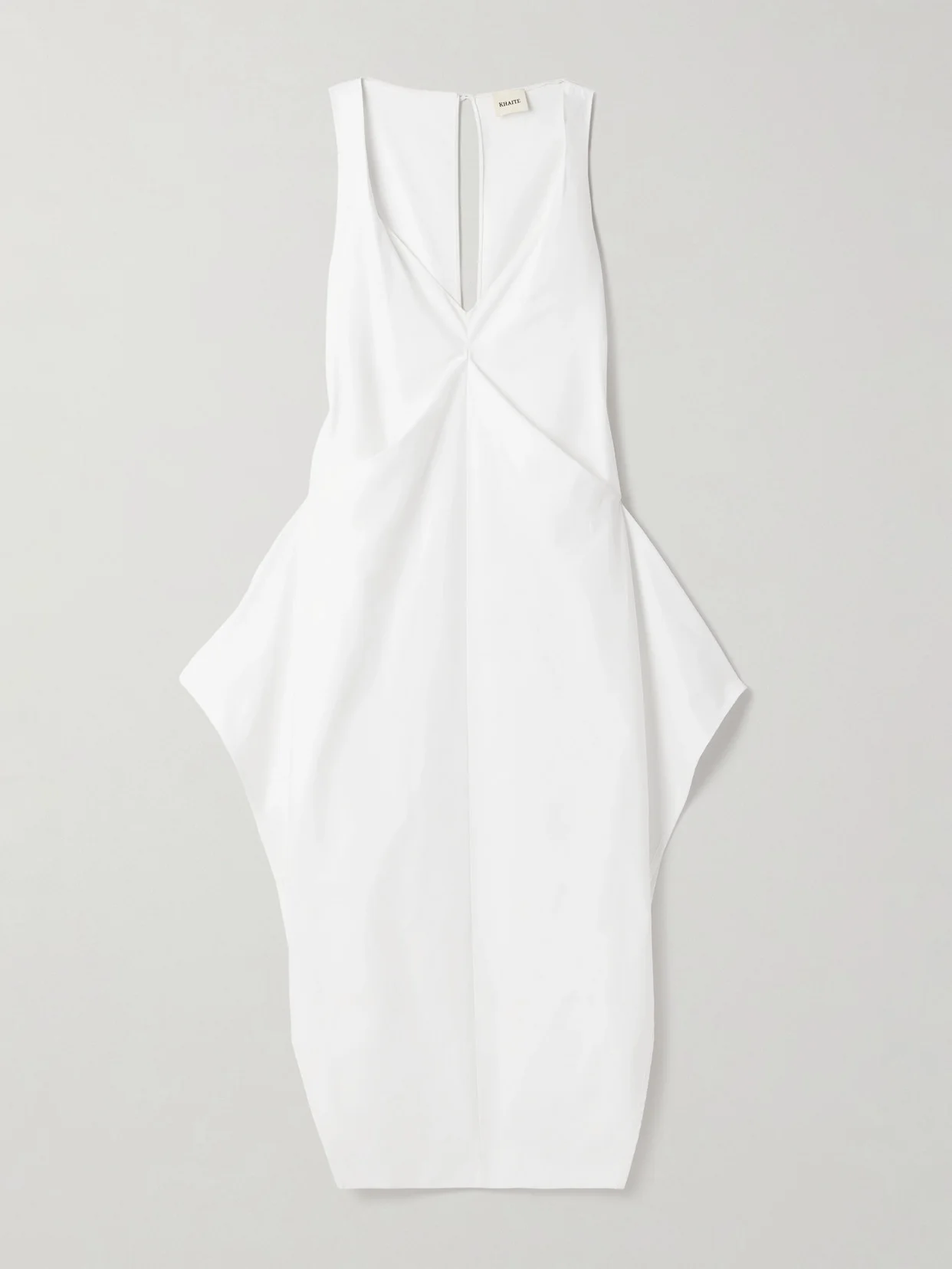 KHAITE's Resort '25 collection elevates minimal designs with unique shapes and details. Made from crisp cotton-poplin, this 'Kenith' gown has a plunging neckline, side splits and strategic pleats that create its distinctive geometric skirt.