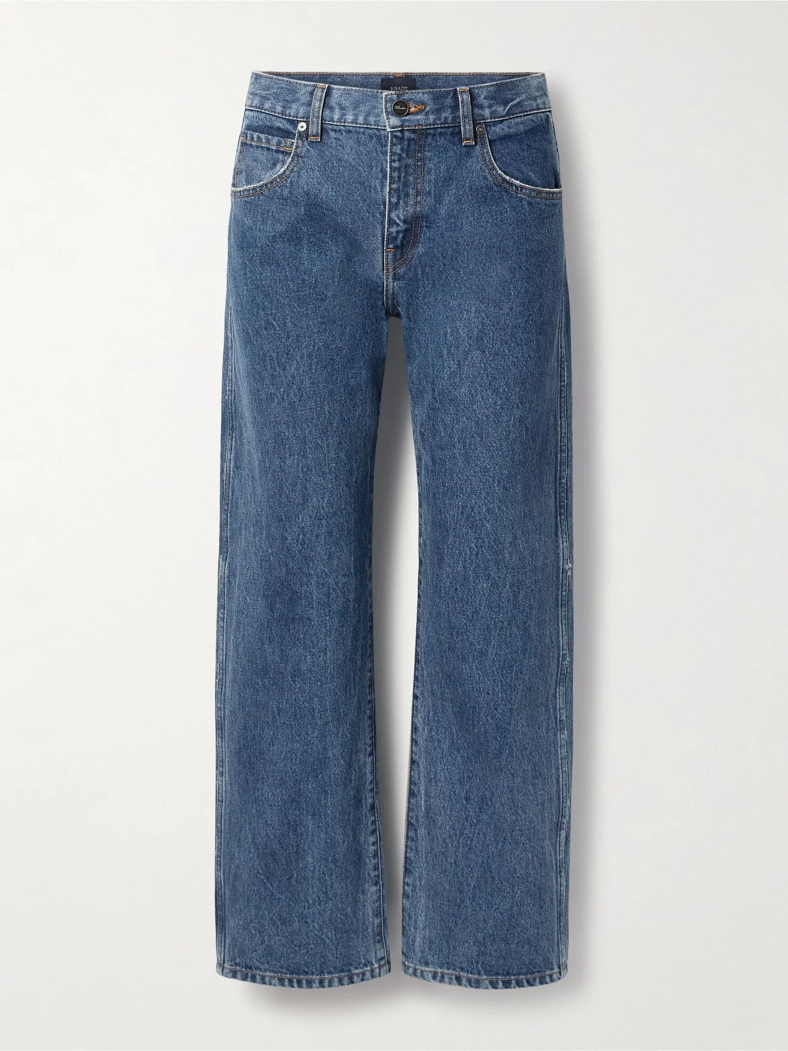 No detail is overlooked when it comes to KHAITE's jeans - each pair is crafted for the perfect fit and carefully finished by hand. This 'Kerrie pair is designed in a low-rise, straight-leg shape and come in a classic blue wash that's subtly faded and distressed. Look closely and you'll spot the brand's moniker etched into the silver-tone button. Details & Care - Blue denim - Button and concealed zip fastening at front - 100% cotton - Designer wash: Boone