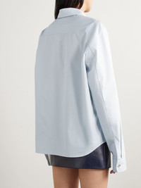 KHAITE infuses classic designs with contemporary attitude. This 'Argo' shirt is made from gently structured cotton-poplin in a subtle sky-blue shade and has a loose fit with a neat collar and particularly long sleeves. Style yours with everything from tailored pants to casual denim. Size & Fit - Fits true to size, take your normal size - Designed for a loose fit - Long in the sleeves - Lightweight, non-stretchy fabric - Model is 180cm/ 5'11" and is wearing a size Small Model measurements: - Bust: 79cm/ 31" - Waist: 61cm/ 24" - Hip: 89cm/ 35" Details & Care - Sky-blue cotton-poplin - Button fastenings through front - 100% cotton; buttons: 100% horn (Buffalo)