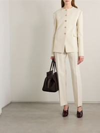 KHAITE's 'Callen' pants will be the foundation of a myriad of looks - style them with everything from simple tanks to cozy sweaters. They're tailored in a straight-leg shape from wool that's blended with plenty of silk and traced with neatly pressed creases along the front. Size & Fit - Fits true to size, take your normal size - Mid-rise, designed for a straight-leg fit - Mid-weight, non-stretchy fabric - Model is 180cm/ 5’11” and is wearing a US 2 Details & Care - Cream wool and silk-blend crepe - Concealed hook, button and zip fastening at front - 71% virgin wool, 29% silk