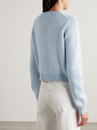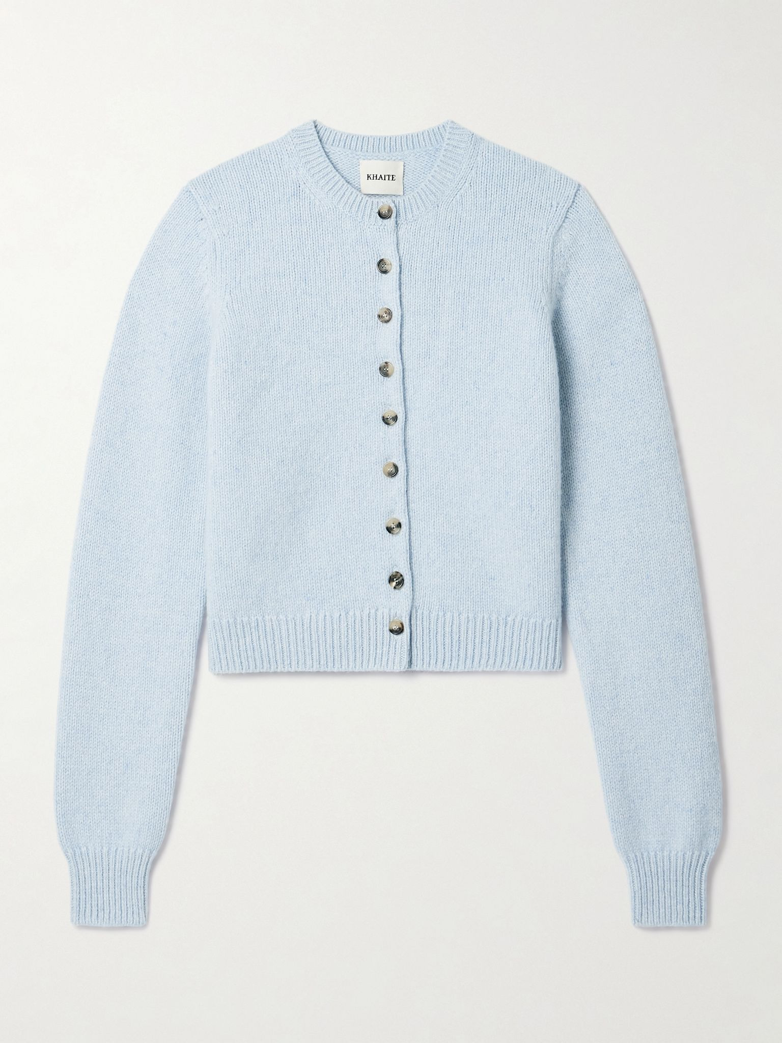 KHAITE's understated approach to design results in pieces that are so easy to style. This 'Everheart' cardigan is made from soft, insulating cashmere and has a slightly loose fit defined by ribbed trims. Fasten the horn buttons up to the crew neck or leave them undone when layering over a camisole. Size & Fit - Fits true to size, take your normal size - Designed for a slim fit - Mid-weight knit - S/M/L sizing Details & Care - Light-blue cashmere - Button fastenings through front - 100% cashmere
