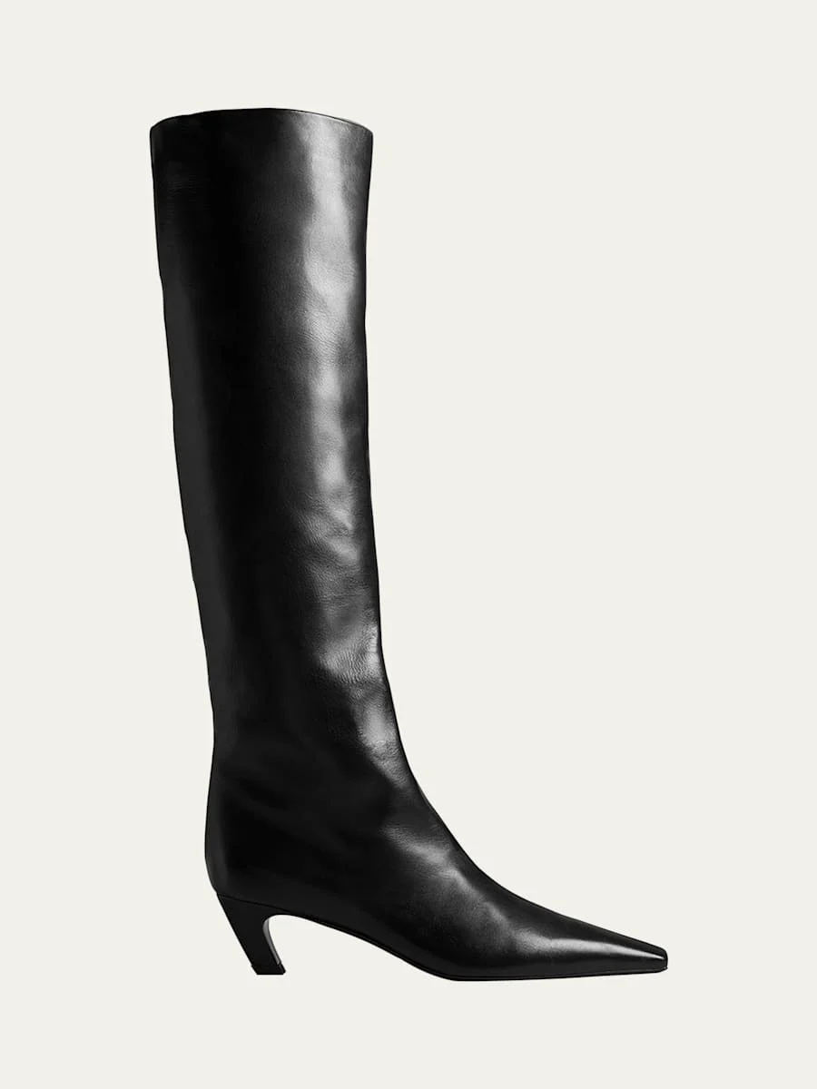 Khaite "Davis" slouchy knee boots in buttery soft calf leather. 1" heel. Square toe. Pull-on style. Imported. Online Inquiries: BGS21_X536B| Store Inquiries: #3514297