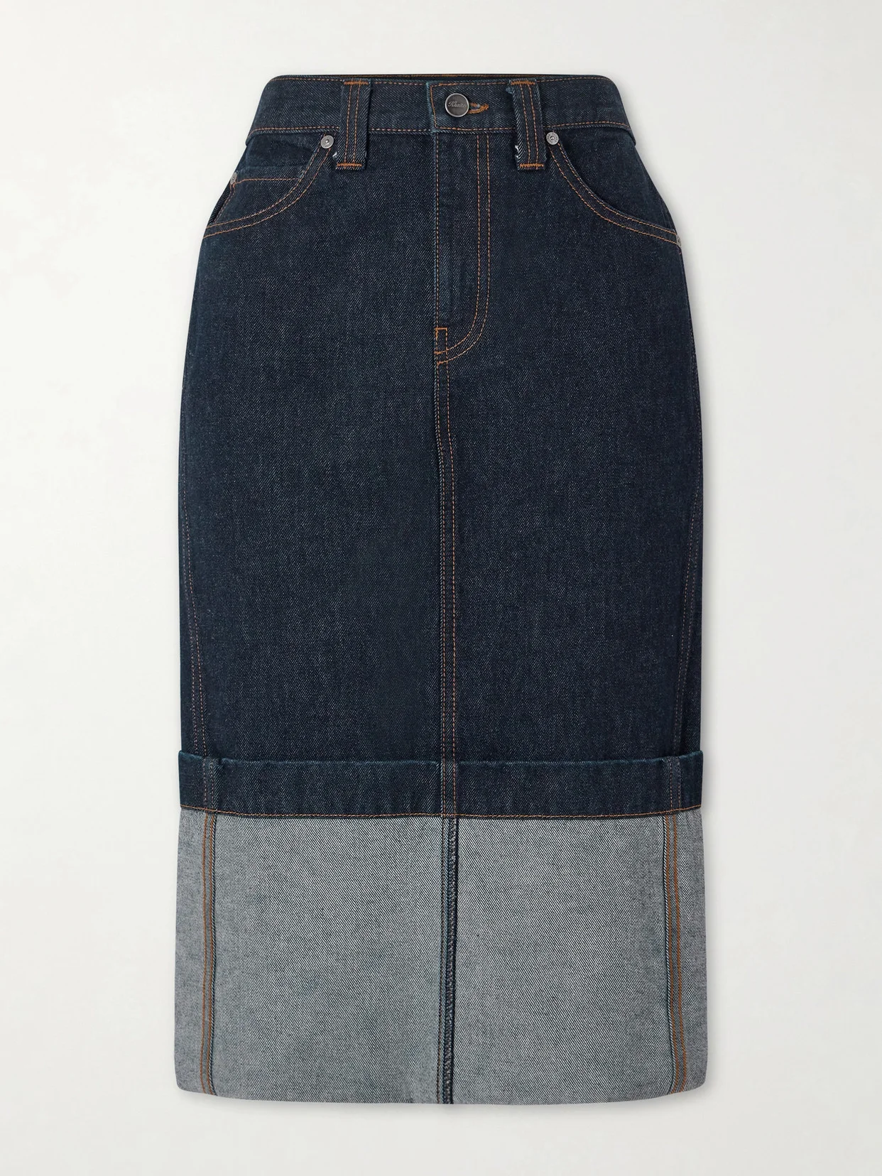 KHAITE's effortlessly modern spirit makes wardrobe staples like this 'Kilian' denim skirt feel totally fresh. Seen on the Spring '26 runway, it comes in a deep 'Benson' wash and has a straight silhouette with an exaggerated turned-up hem. Style yours with a tucked-in blouse and knee boots for a chic daytime look.