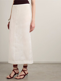 KHAITE's 'Lalisa' skirt is cut from ivory silk-organza that's slightly structured and semi-sheer. It has a straight shape with a back split, so you can move with ease. Wear it with one of the label's tunics and strappy heels. Size & Fit - Fits true to size, take your normal size - Maxi-length, designed to be worn at the hip - Lightweight, sheer, non-stretchy fabric - Model is 180cm/ 5’11” and is wearing a US 2 Details & Care - Ivory silk-organza - Button fastening at back - 100% silk - Designer color: Chalk