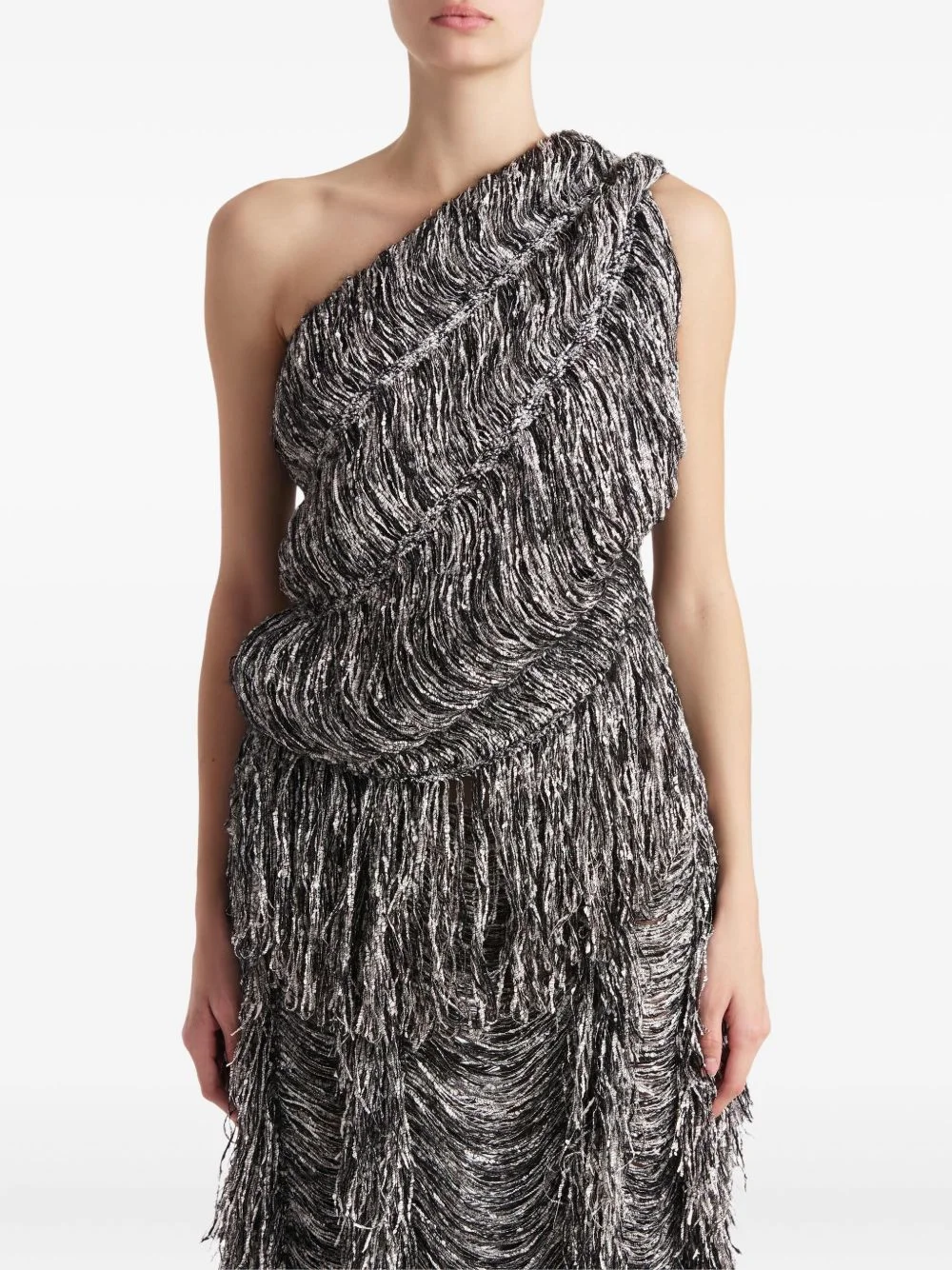 Lara top Highlights - Black/white - Fringed detailing - One-shoulder design - Open back - Sleeveless Made in United States Composition Polyurethane 44%, Wool 44%, Polyamide 10%, Silk 2% Washing instructions Read Manufacturer Guidelines