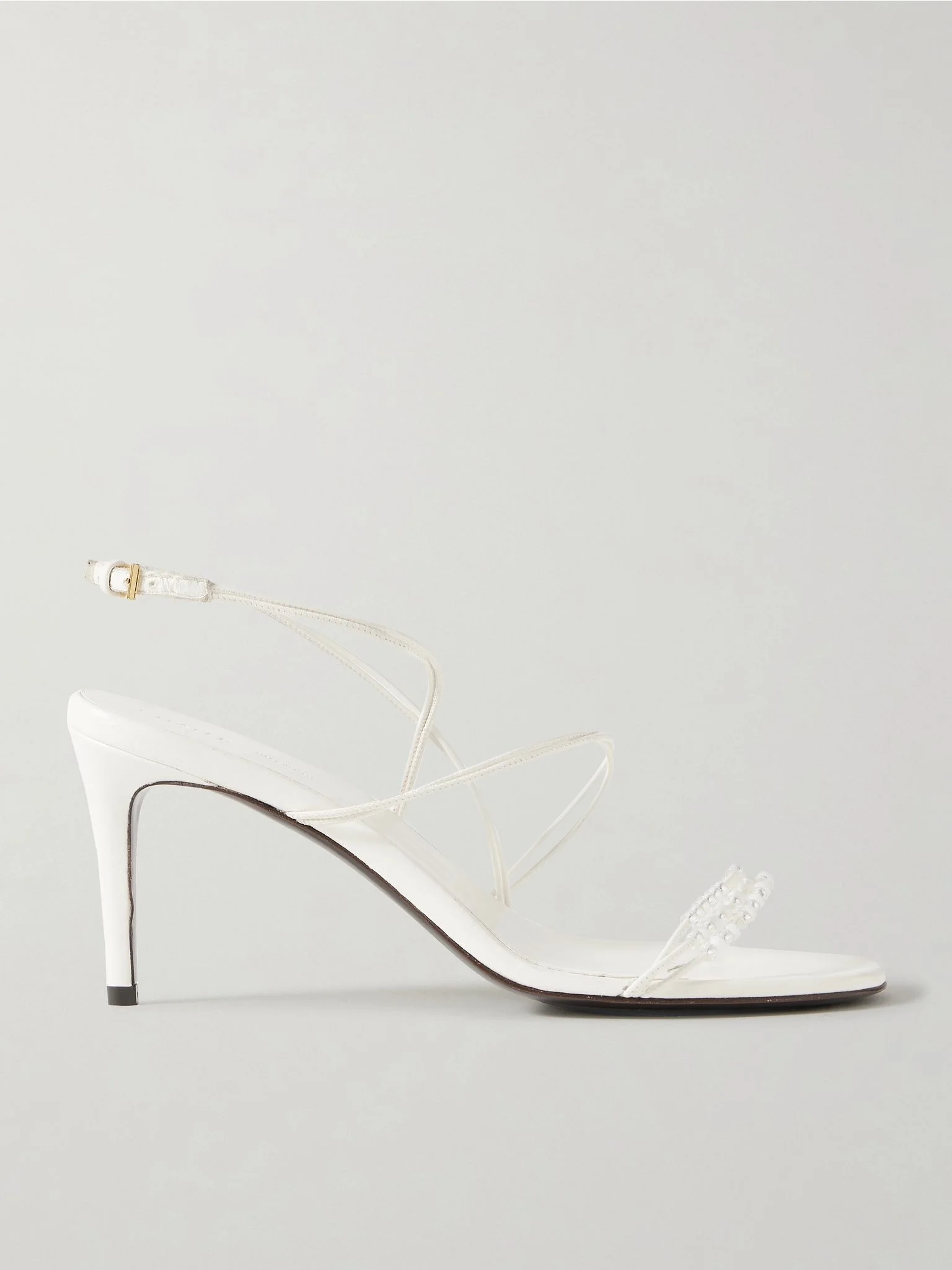 KHAITE's 'Loop sandals are designed with foot-framing straps, including a trio of bead-embellished ones along the toes. Made from smooth leather, they're set on slender 75mm heels and have adjustable buckles for a secure fit. Details & Care - Heel measures approximately 75mm/ 3 inches - White leather (Goat) - Buckle-fastening ankle strap - Designer color: Optic White