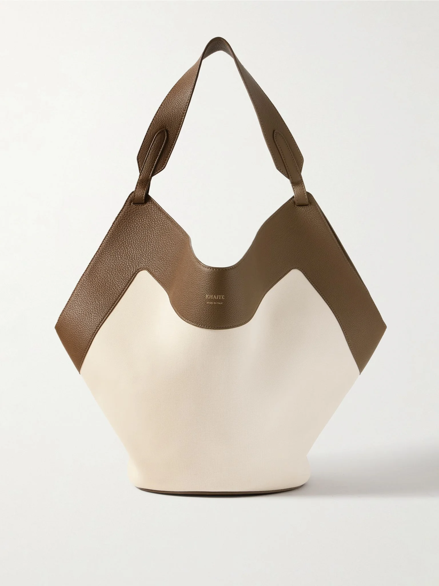 The unstructured, sculptural shape of KHAITE's 'Lotus' tote is inspired by the fluidity of a scarf. Sized to fit your phone, wallet, water bottle and small compact, this spacious style has been made in Italy from canvas and leather and left unlined for lightness. It has a round base and slim top handle that fits comfortably over the shoulder. Details & Care - Cream canvas, brown leather (Calf) - Top handle - Detachable zipped pouch - Unlined - Open top