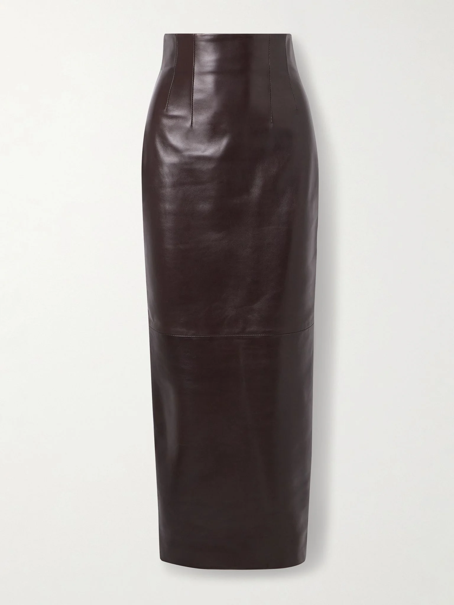 KHAITE's 'Loxley' skirt feels so refined thanks to its minimal column silhouette. As seen on the runways, this leather version has a darted waist and falls to an ankle-grazing hem that's split along the back. The smoothing crepe de chine lining stops it from clinging. Size & Fit - Fits true to size, take your normal size - Maxi-length, designed to be worn at the waist - Firm, non-stretchy leather - Model is 180cm/ 5’11” and is wearing a US 4 Details & Care - Dark-brown leather - Concealed hook and zip fastening at back - 100% leather (Lamb) - Fully lined - Specialist clean - Designer color: Mud