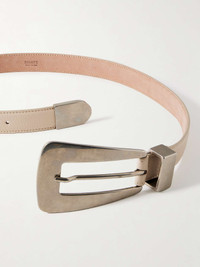 EDITORS'NOTES KHAITE knows that the right belt can pull an entire outfit together. This ‘Lucca’ style is designed with an antiqued silver-tone buckle magnified to dramatic proportions. It's made from textured-leather and makes a statement whether slipped through the loops of pants or used to cinch one of the label's dresses. SIZE & FIT - Designed to be worn on the hips or waist - Measurements can be found in the link below DETAILS & CARE - Beige textured-leather (Calf) - Buckle fastening - Designer color: Dark Ivory