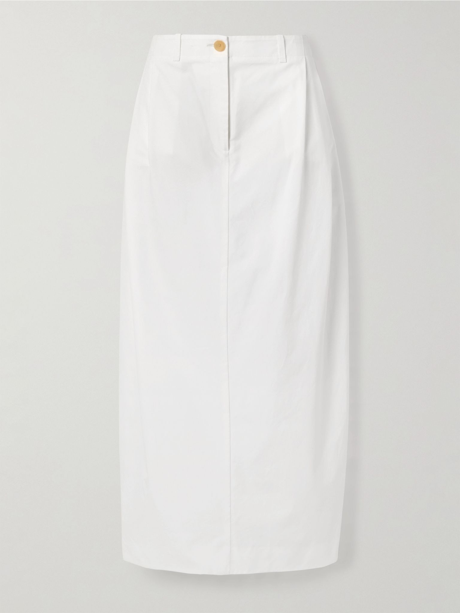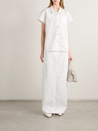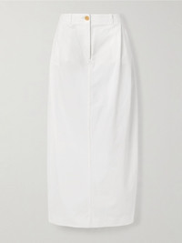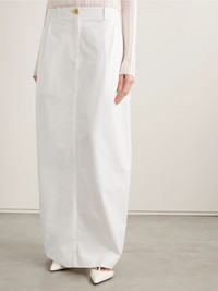KHAITE experiments with fabric for Spring '25, and this 'Lucian' skirt comes in a crisp cotton-poplin that appeared more than once on the runway. It has wide pleats on the waistband, a generous back split and a slightly curved silhouette. Style yours with one of the brand's blouses in the same color and a pair of pumps. Size & Fit - Fits true to size, take your normal size - Maxi-length, designed to be worn at the hip - Lightweight, semi-sheer, non-stretchy fabric - Model is 180cm/ 5'11" and is wearing a US 4 Details & Care - White cotton-poplin - Button and concealed zip fastening at front - 100% cotton; button: 100% horn (Buffalo)