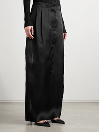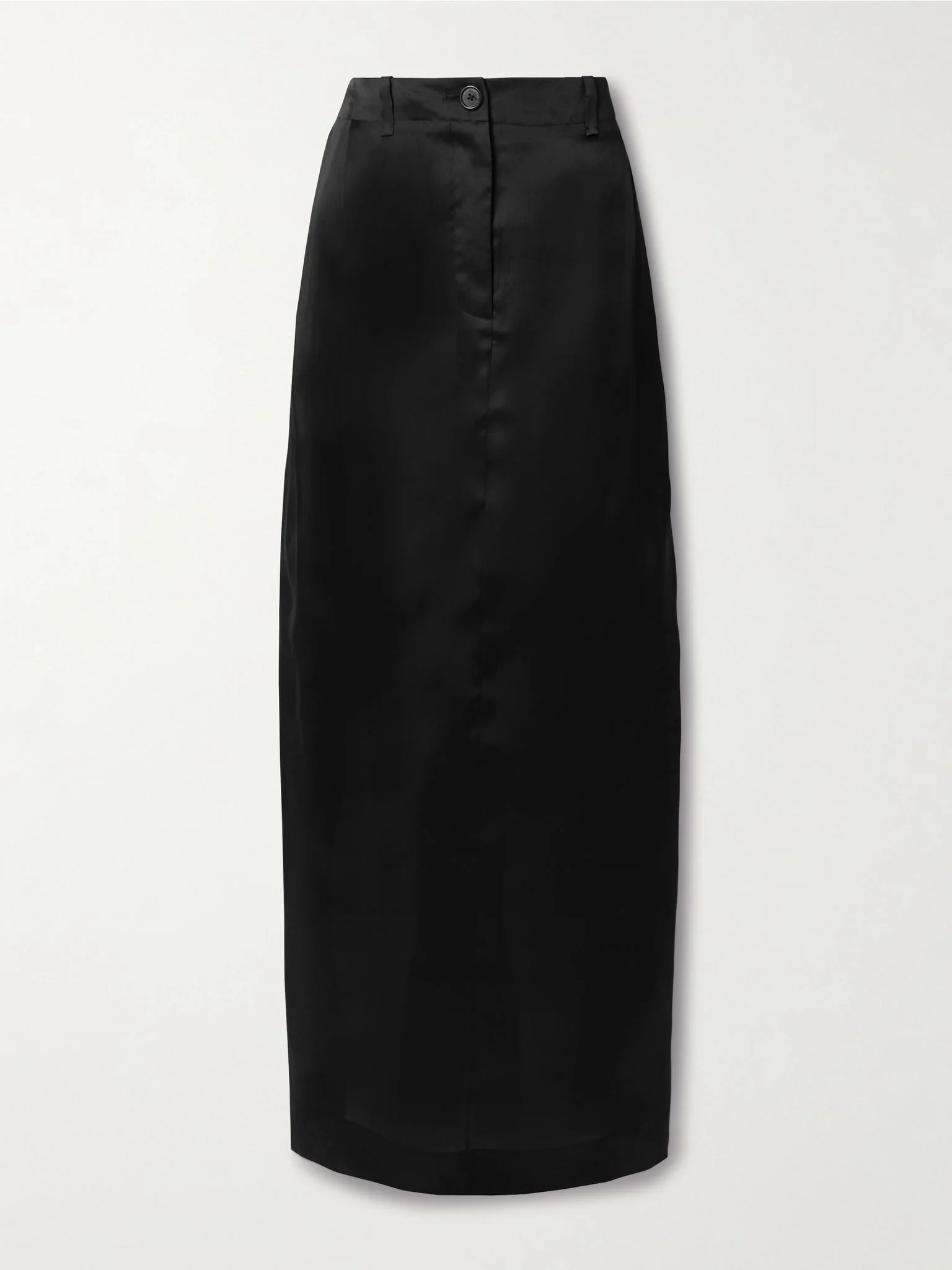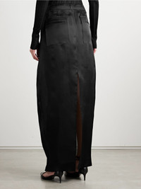 KHAITE experiments with fabric for Spring '25, and this 'Lucian' skirt comes in a silk-organza that appeared more than once on the runway. It has wide pleats on the waistband, a generous back split and a slightly curved silhouette. Style yours with one of the brand's blouses in the same color and a pair of pumps. Size & Fit - Fits true to size, take your normal size - Maxi-length, designed to be worn at the hip - Lightweight, semi-sheer, non-stretchy fabric - Model is 180cm/ 5'11" and is wearing a US 4 Details & Care - Black silk-organza - Button and concealed zip fastening at front - 100% silk; button: 100% horn (Buffalo)