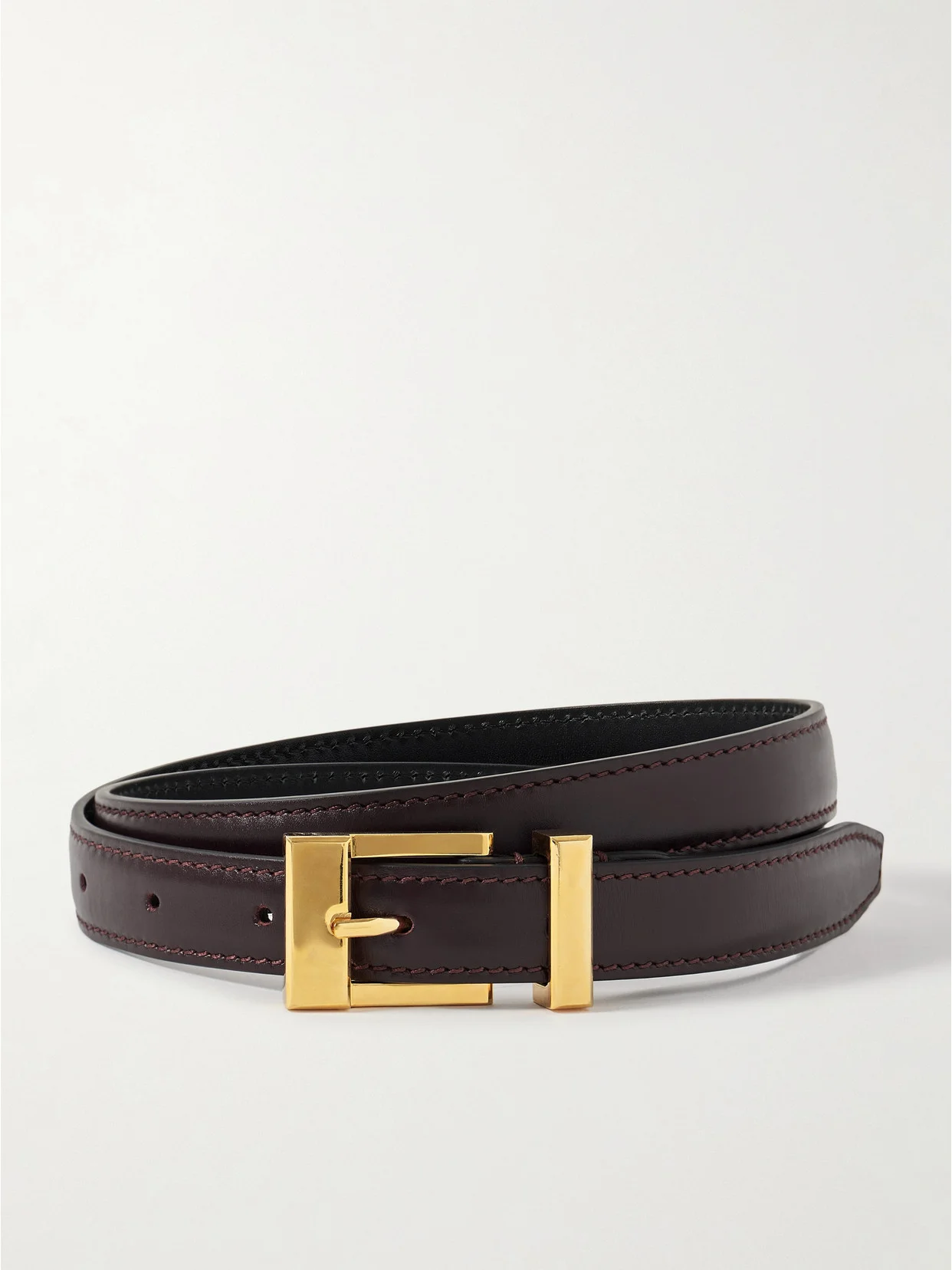 KHAITE's 'Manhattan' belt is a versatile, refined accessory that complements a variety of outfits. It's crafted from smooth burgundy leather and features a sleek gold-tone buckle. Thread yours through the loops of tailored pants or use it to cinch the waist of a dress.