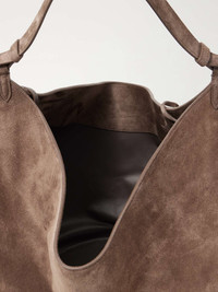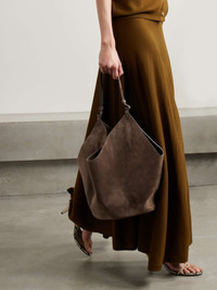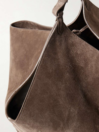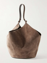 EDITORS'NOTES The unstructured, sculptural shape of Khaite's 'Lotus' tote is inspired by the fluidity of a scarf. It's been made in Italy from light-brown suede and has a round base and slim top handle that fits comfortably over the shoulder. The interior is spacious enough to stow your wallet, cosmetic case and sunglasses. SIZE & FIT This item’s measurements are: - Height: 32cm / 12.6in - Width: 40cm / 15.7in - Depth: 22cm / 8.7in DETAILS & CARE - Light-brown suede (Calf) - Top handle - Satin lining - Ties at top - Designer color: Toffee