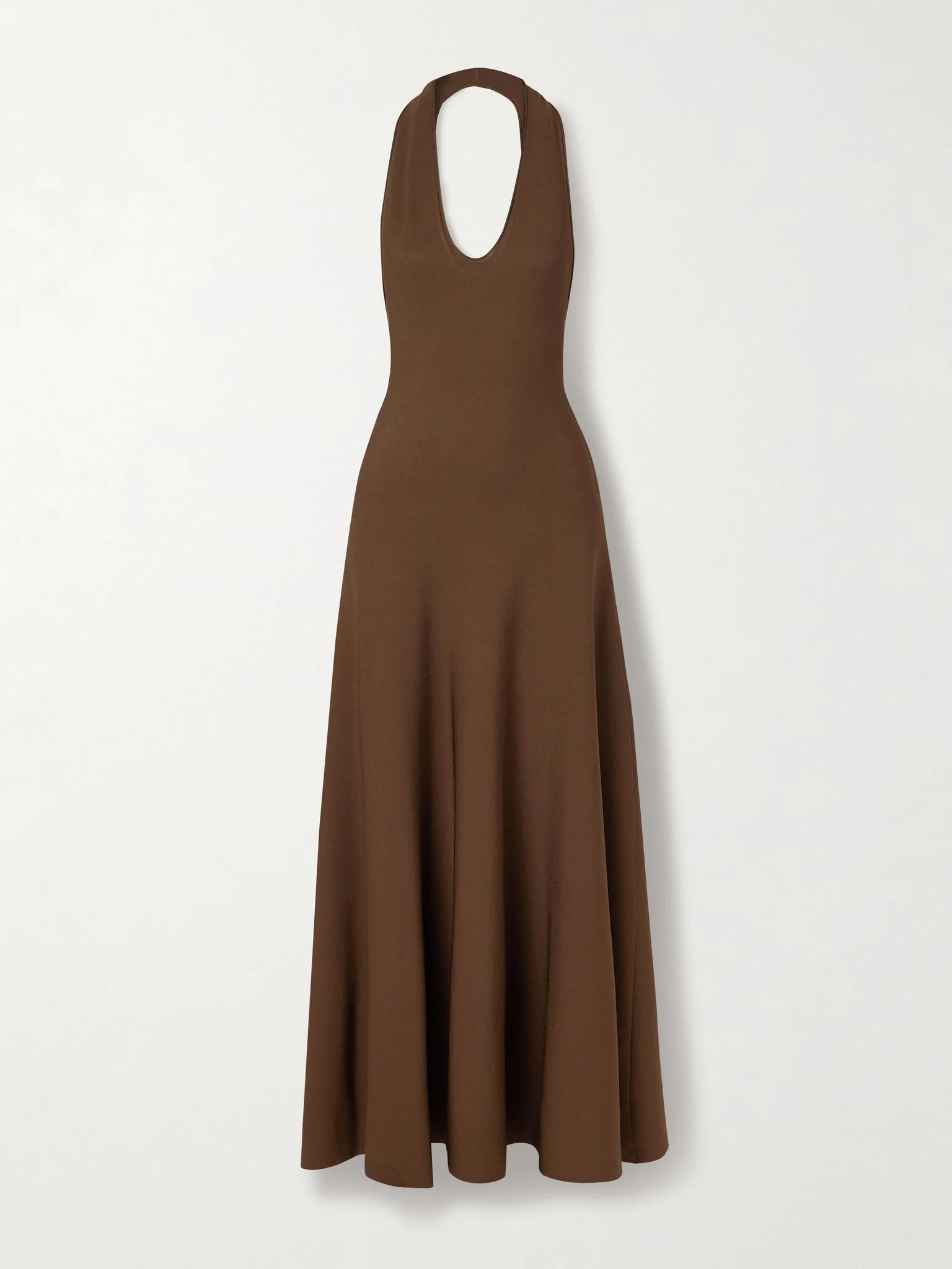 KHAITE's 'Melina' dress is proof that simple design often makes the biggest statement. It's made from 'Bark' stretch-knit to hug your figure and has a halter neck and flowy maxi skirt. Size & Fit - Fits true to size, take your normal size - Designed for a slim fit - Mid-weight knit - Model is 180cm/ 5'11" and is wearing a size Small Details & Care - Dark-brown stretch-knit - Slips on - 83% viscose, 17% polyester - Unlined - Designer color: Bark