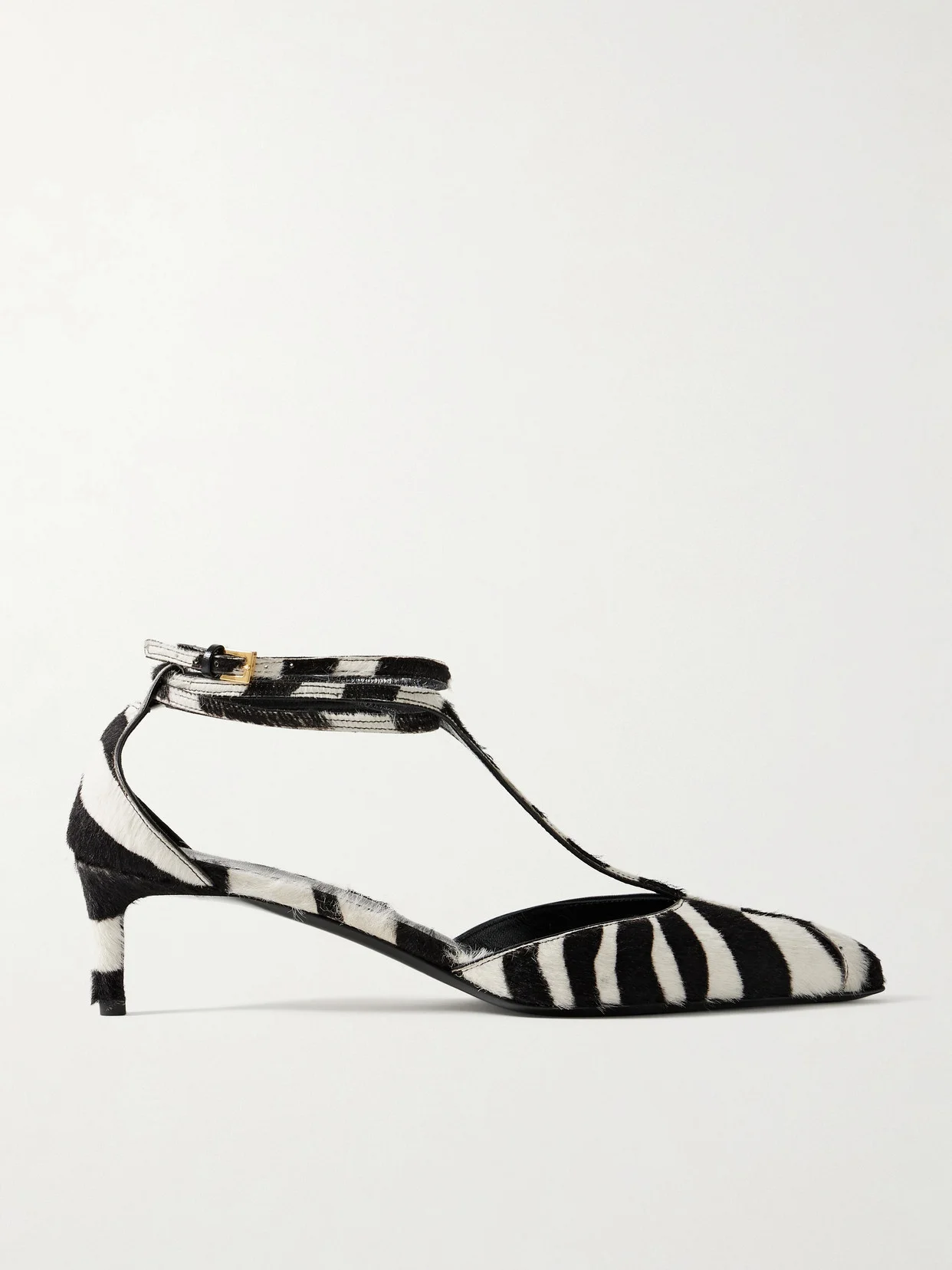 KHAITE's 'Mia' pumps are designed with slender straps that connect at the pointed toe and trace the arch before wrapping around the ankle. This version is made from animal-print calf hair and has manageable 45mm heels.