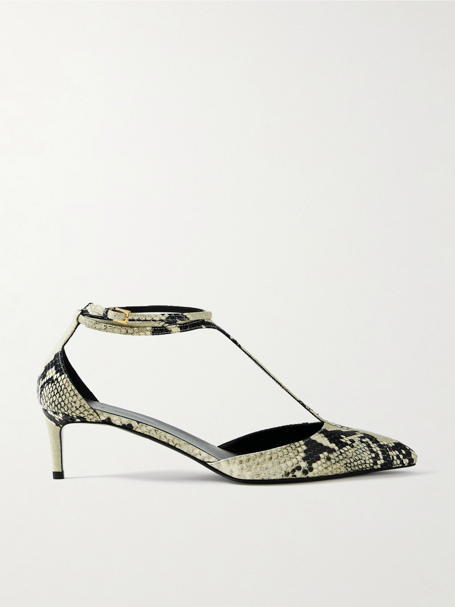 KHAITE's 'Mia' pumps are designed with slender straps that connect at the pointed toe and trace the arch before wrapping around the ankle. This version is made from snake-effect leather and has manageable 45mm heels. Size & Fit - Fits true to size, take your normal size - Italian sizing Details & Care - Heel measures approximately 45mm/ 2 inches - Snake-effect leather (Calf) - Buckle-fastening ankle strap