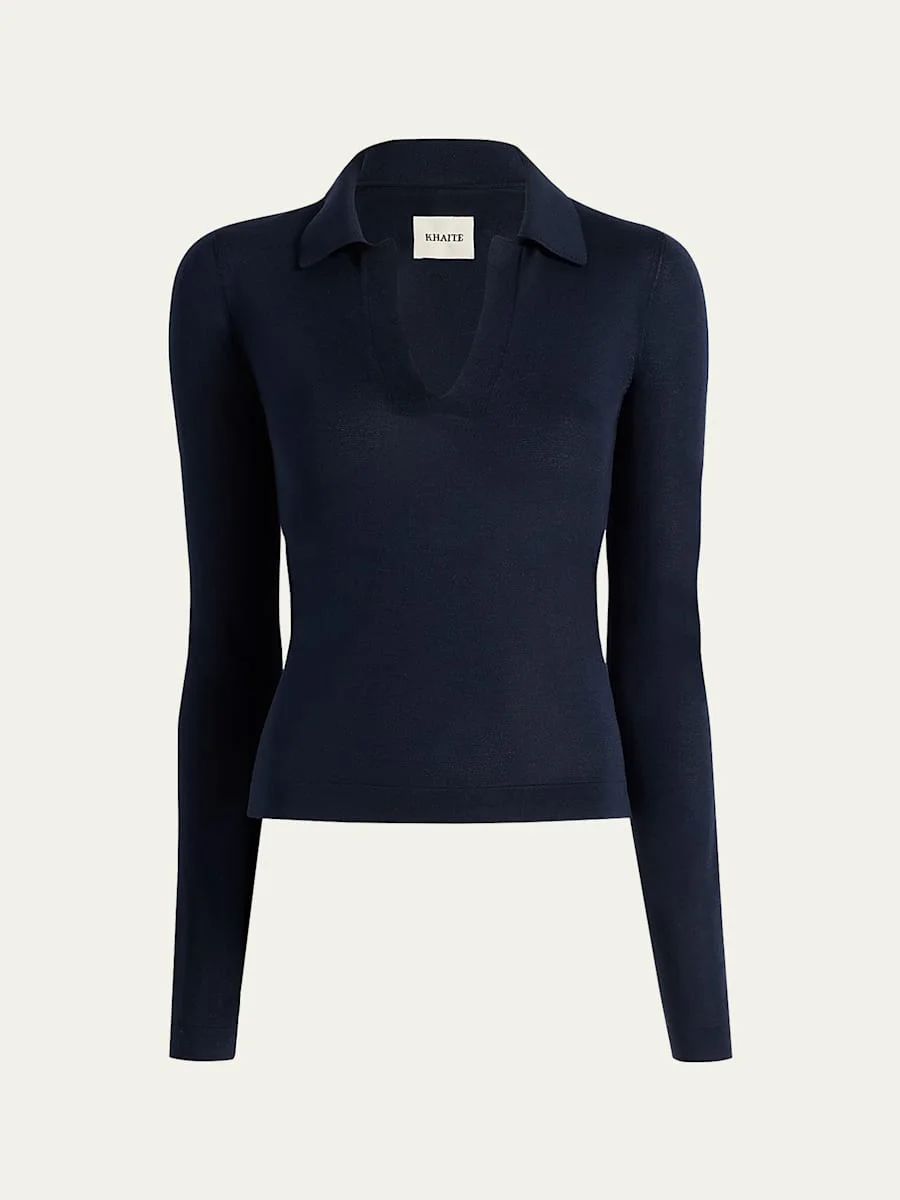 The "Mikel" polo top from Khaite is crafted from a woolblend knit V neckline with a spread collar Long sleeves Slim fit Ribbed cuffs and hem Pullover style Wool/hemp/nylon/polyamide Dry clean Made in Italy