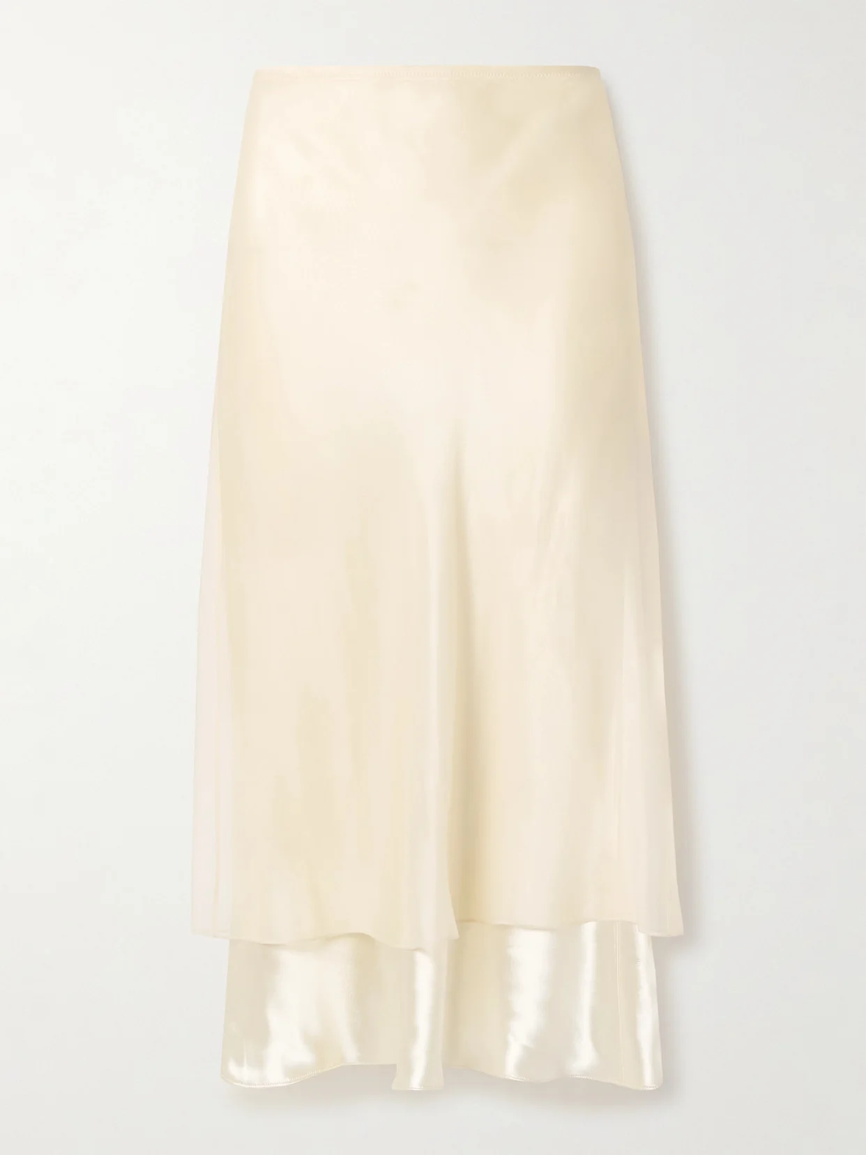 KHAITE's Spring '25 collection is a masterclass in classic yet contemporary design. This 'Monina' skirt is cut from glossy satin with a sheer organza overlay for a touch of contrast.