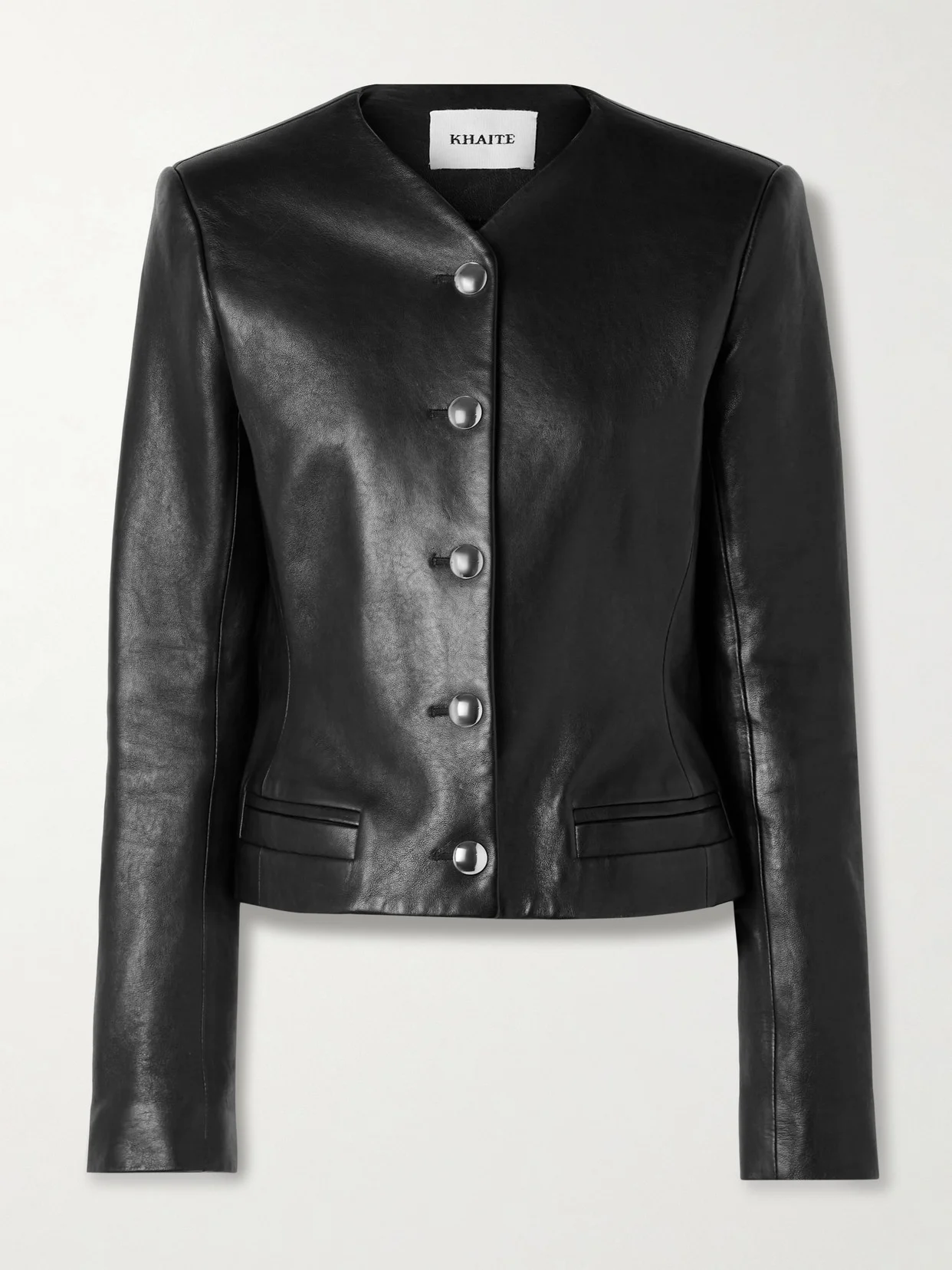 KHAITE's 'Nara' jacket is a sleek and sophisticated layer that will elevate day and night outfits alike. It's made from buttery soft leather that's fully lined in smooth satin and has structured padded shoulders.. Match your jewelry to the polished silver-tone buttons.