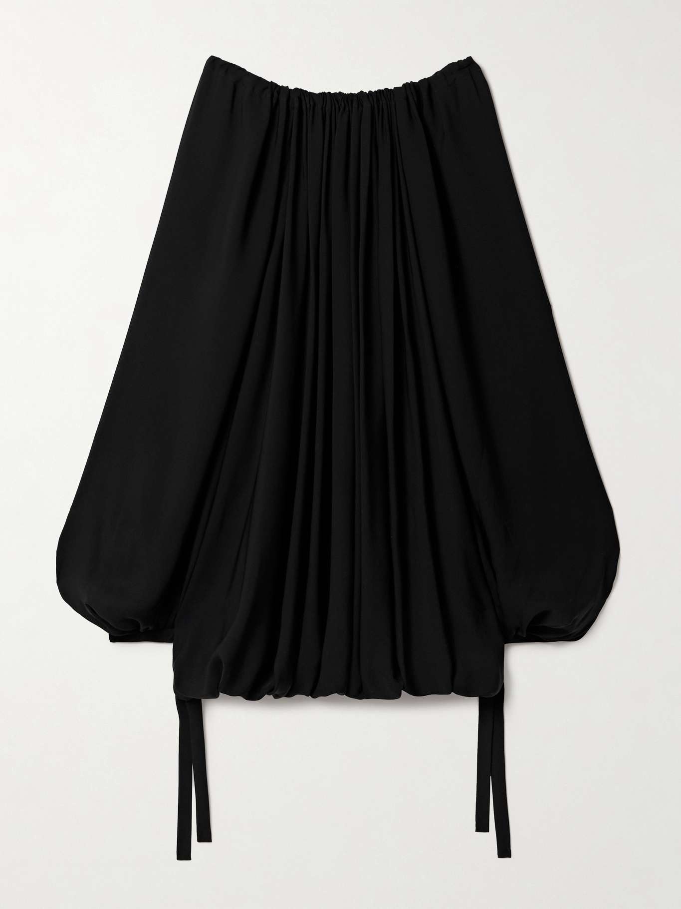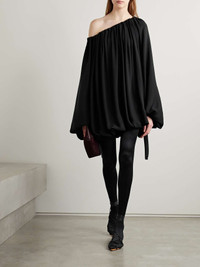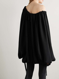 EDITORS'NOTES KHAITE's 'Nash' blouse is just as elegant as it is effortless. Cut from airy silk crepe de chine, it has a gathered off-the-shoulder neckline and voluminous silhouette with blouson sleeves and adjustable ties along the hem. The tunic-style length means it can double as a mini dress. SIZE & FIT - Fits true to size, however those who are between sizes should take the smaller size - Intended for an oversized fit, cut to be worn very loose - Elasticated at the hem - Lightweight, non-stretchy fabric - Model is 180cm/ 5’11” and is wearing a US 2 DETAILS & CARE - Black silk crepe de chine - Slips on - 100% silk