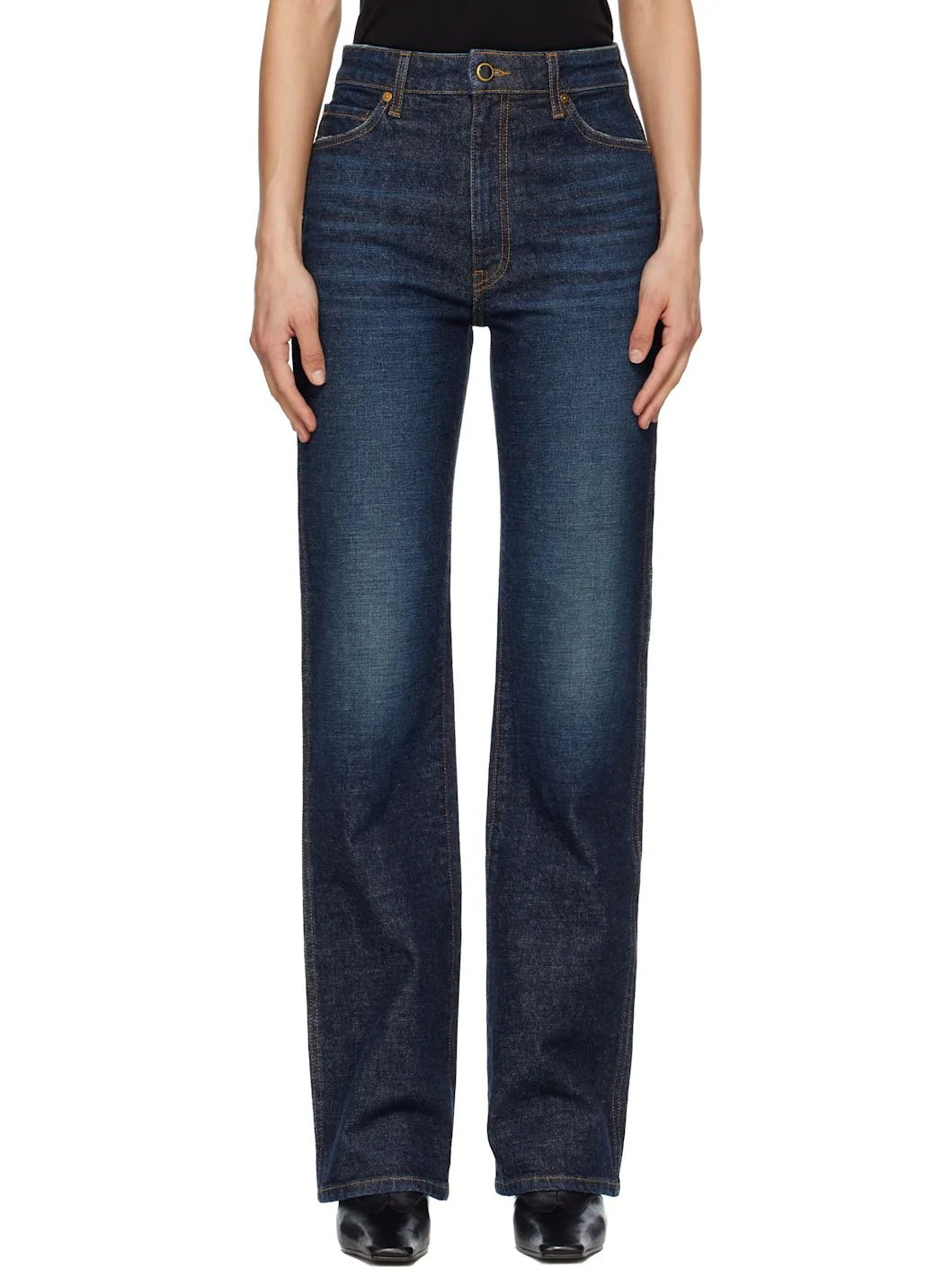 Hand-finished stretch denim jeans. · Fading and whiskering throughout · High-rise · Straight-leg · Belt loops · Five-pocket styling · Zip fly · Contrast stitching in tan Supplier color: Lansing 98% cotton, 2% polyurethane. Made in United States 261914F069012