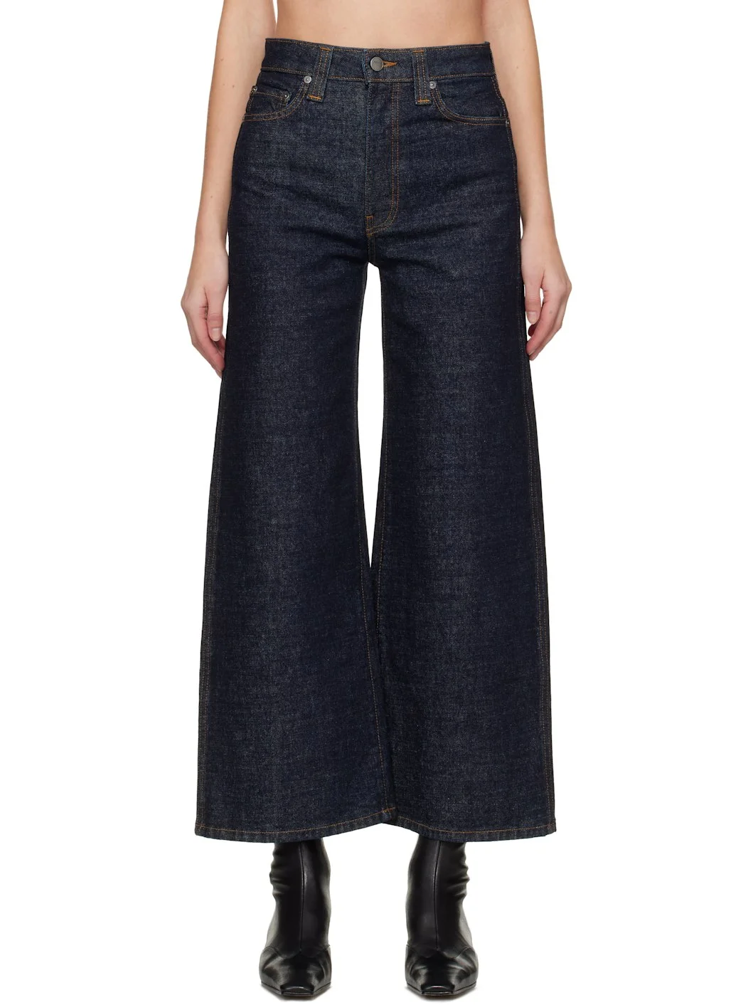 Hand-finished stretch denim jeans. · Wide-leg · High-rise · Belt loops · Five-pocket styling · Zip fly · Cropped leg · Contrast stitching in tan Supplier color: Benson 98% cotton, 2% elastane. Made in United States 261914F069009