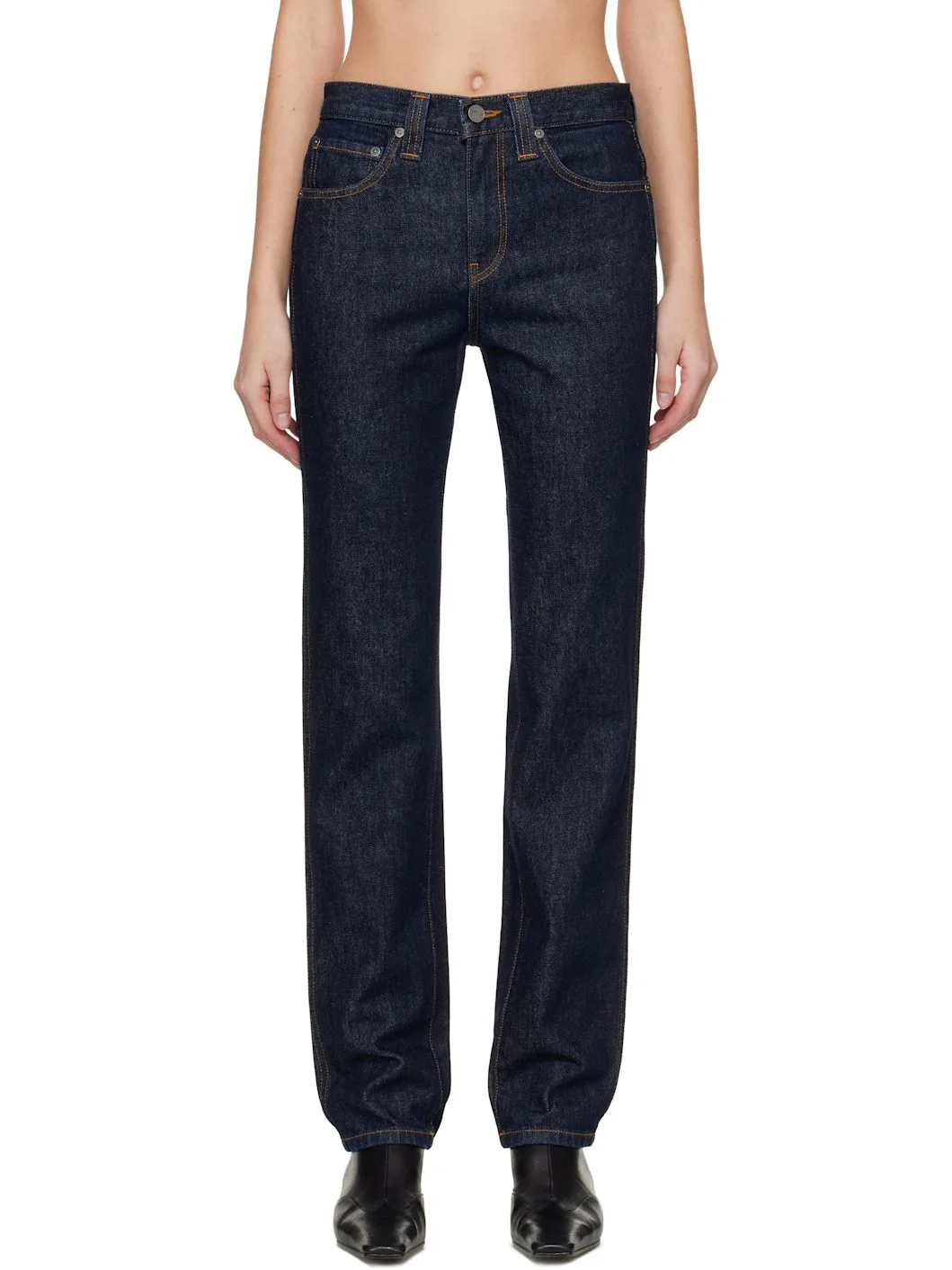 Hand-finished non-stretch denim jeans. · Straight-leg · Mid-rise · Belt loops · Five-pocket styling · Zip fly · Contrast stitching in tan Supplier color: Benson 100% cotton. Made in United States 261914F069006
