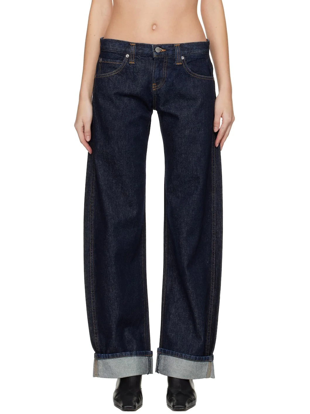 Hand-finished non-stretch denim jeans. · Low-rise · Belt loops · Five-pocket styling · Zip fly · Curved outseams · Contrast stitching in tan Supplier color: Benson 100% cotton. Made in United States 261914F069003