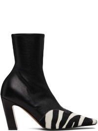 Mid-calf stretch grained lambskin and calf-hair boots. · Pointed square toe · Zebra pattern printed at vamp · Zip closure at inner side · Covered block heel with rubber injection · Calfskin sole · Heel: H3.5" Supplier color: Black/White Upper: lambskin. Sole: calfskin, rubber. Made in Italy 261914F113005