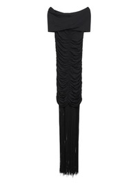 draped fringe dress Highlights - Black - Off-shoulder neckline - Draped bodice - Fringe trim Made in Italy Composition Viscose 95%, Polyamide 5% SIZE & FIT FittingInformation Designed for a close fit throughout Made from a midweight non-stretch fabric, this piece offers minimal elasticity when worn Washing instructions Read Manufacturer Guidelines