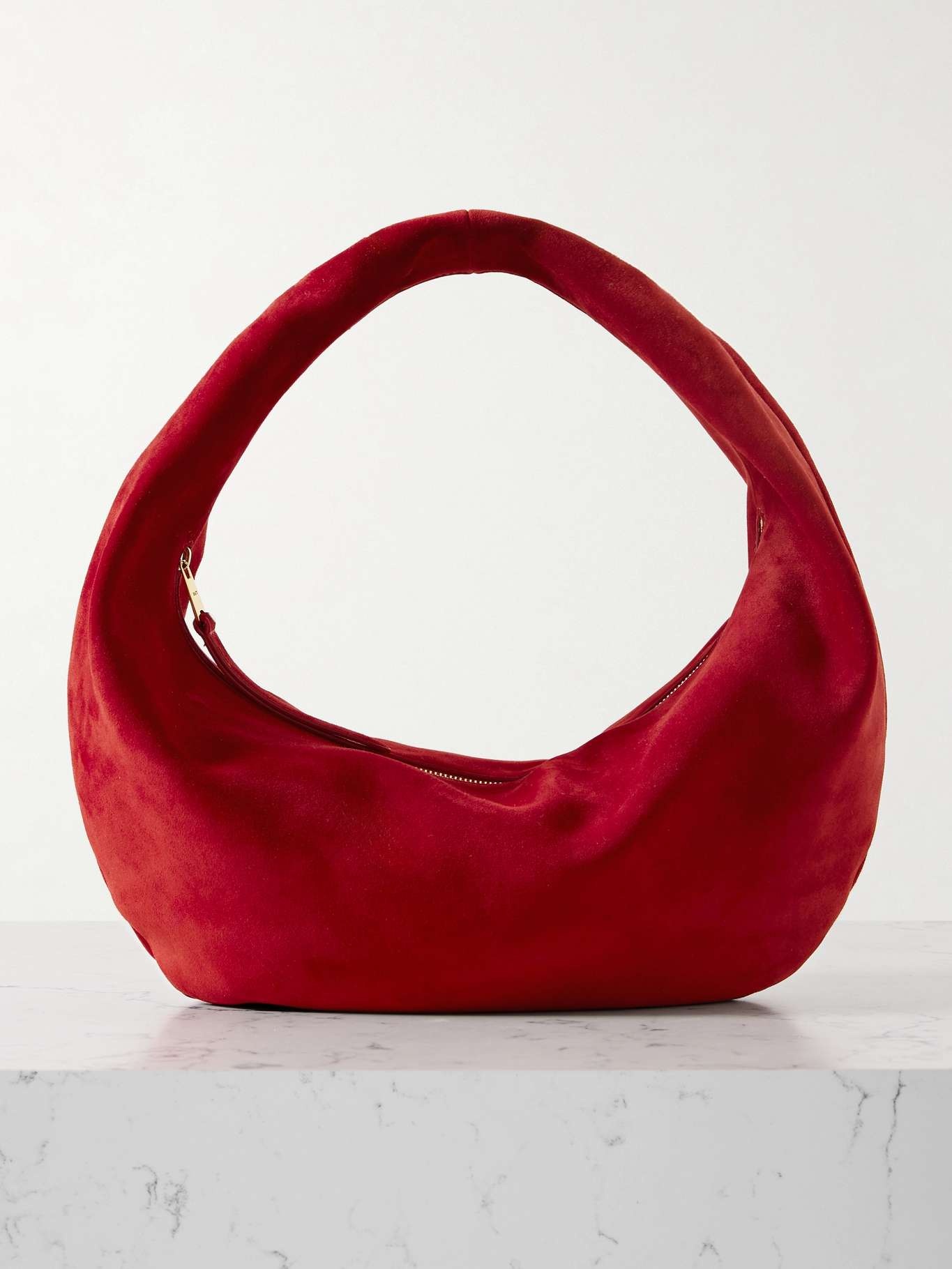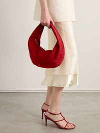 EDITORS'NOTES KHAITE's 'Olivia' tote is designed in a distinctive circular silhouette with a top zip that extends up the handle. Made from 'Rebel' red suede in an unstructured shape, it loops easily over your shoulder or the crook of your arm. It's perfectly sized to store your phone, cardholder and keys. SIZE & FIT This item’s measurements are: - Handle Drop: 16cm / 6.3in - Height: 20cm / 7.9in - Width: 33cm / 13in - Depth: 13cm / 5.1in DETAILS & CARE - Red suede (Calf) - Top handle - Leather lining - Zip fastening along top - Designer color: Rebel - Weighs approximately 0.4lbs/ 0.2kg