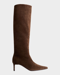 Khaite "Ona" soft suede knee boots 2.25 in / 55 mm stiletto heel Pointed toe Leather outsole Professional cleaning recommended Made in Italy