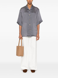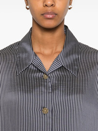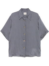 striped shirt Highlights - Navy blue - Front button fastening - Straight-point collar - Drop shoulder - Half-length sleeves Made in United States Composition Viscose 86%, Silk 14% SIZE & FIT Model measurements Height 5 ft 10 in(1.77 m) Bust/Chest 33.07 in(84 cm) Hips 37 in(94 cm) Waist 24.8 in(63 cm) FittingInformation Designed to be unstructured, offering a loose fit throughout Made from a midweight non-stretch fabric