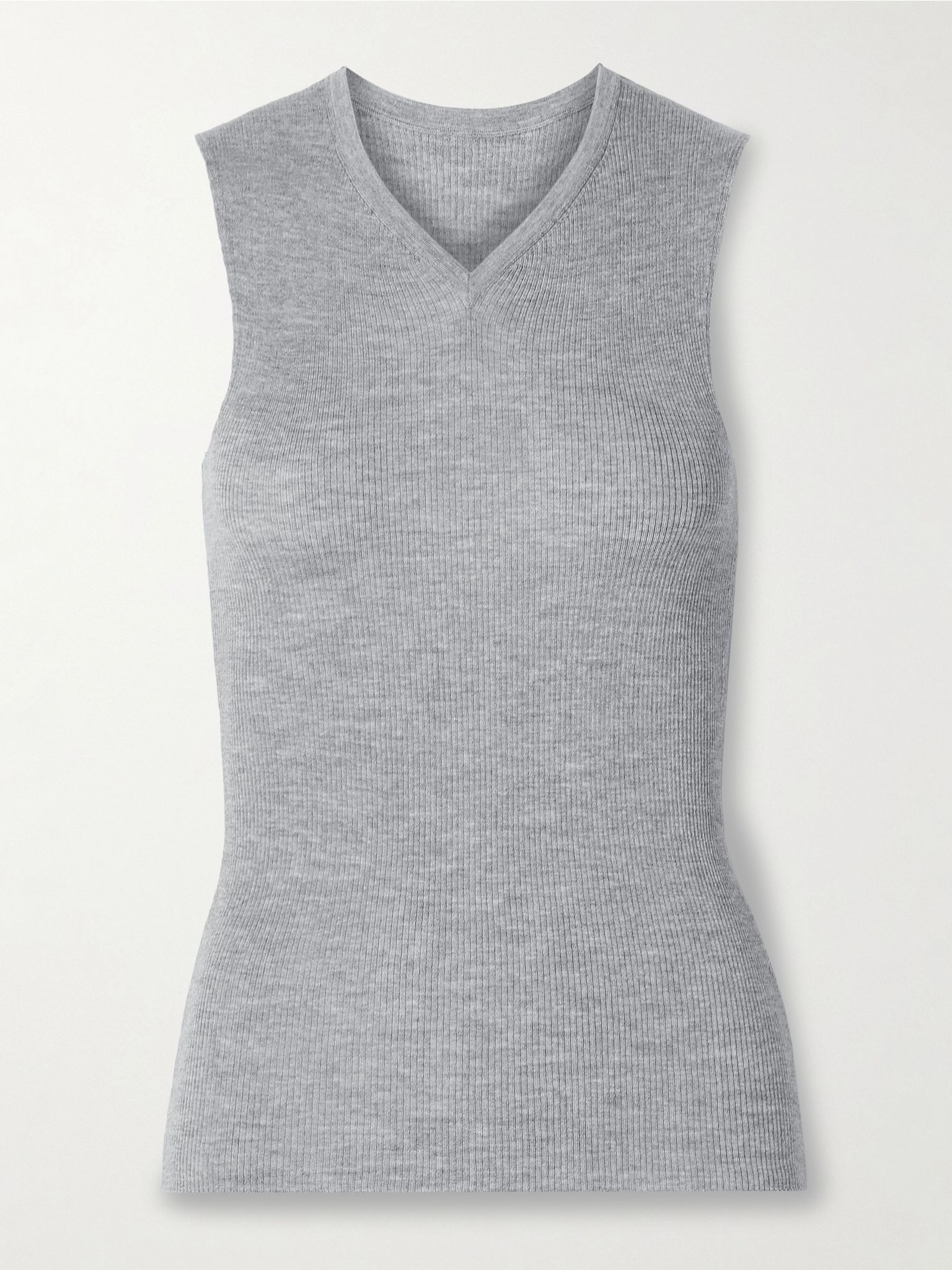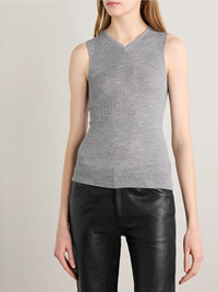 KHAITE’s ‘Renato’ tank has a minimalist design, ensuring it's easy to style. It’s made from soft wool-blend jersey with a ribbed finish and is cut for a close, flexible fit with a high V-neckline. Wear yours solo or underpinning tailoring. Details & Care - Gray melange wool-blend jersey - Slips on - 97% wool, 2% polyamide, 1% polyurethane - Designer color: Mercury