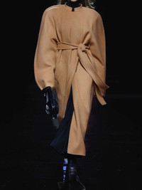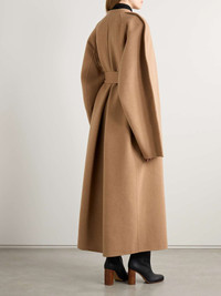 KHAITE's dynamic Fall '24 collection features exaggerated silhouettes and quality materials. This oversized 'Rothen' coat is tailored from double-faced wool, partially lined and detailed with strong shoulder pads and a waist-cinching belt. Size & Fit - Fits true to size, take your normal size - Designed for an oversized fit, cut to be worn very loose - Use the tie belt to cinch in at the waist - Weighted, non-stretchy fabric - Model is 180cm/ 5’11” and is wearing a size Small Details & Care - Camel wool - Slips on - 100% wool