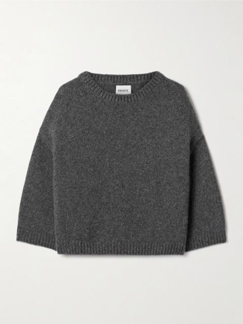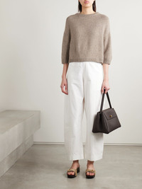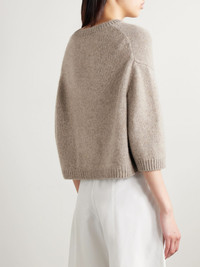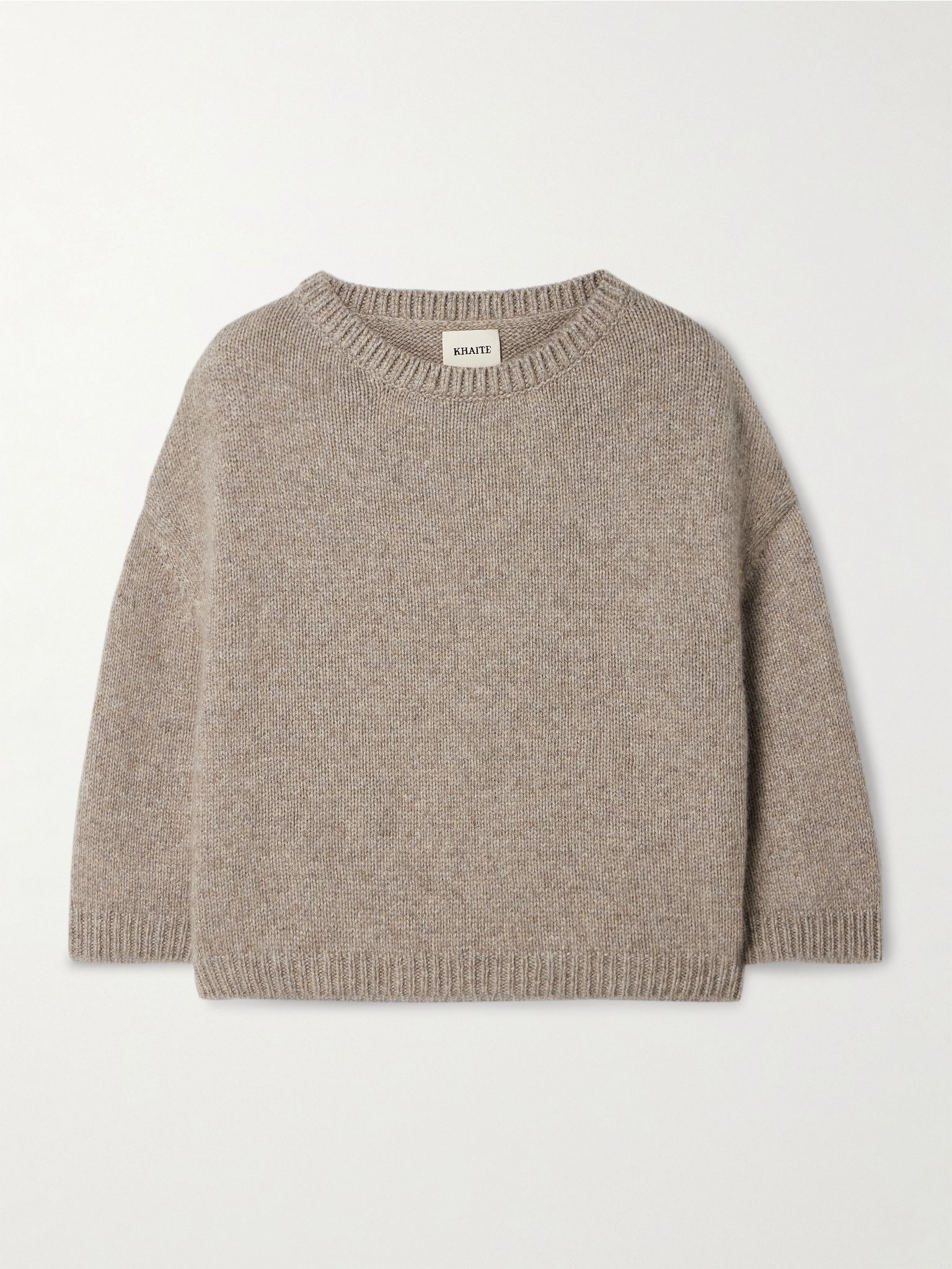 Slight tweaks to the classic shape make KHAITE's 'Sabina' sweater feel distinct. Designed with dropped, slightly snug shoulders, it's made from soft, insulating cashmere and has ribbed trims outlining the crewneck and abbreviated sleeves. Size & Fit - Fits true to size, take your normal size - Designed for a relaxed fit - Dropped shoulder seam - Cropped sleeves - Lightweight knit - Model is 180cm/ 5’11” and is wearing a size Small Details & Care - Taupe cashmere - Slips on - 100% cashmere - Designer color: Sepia