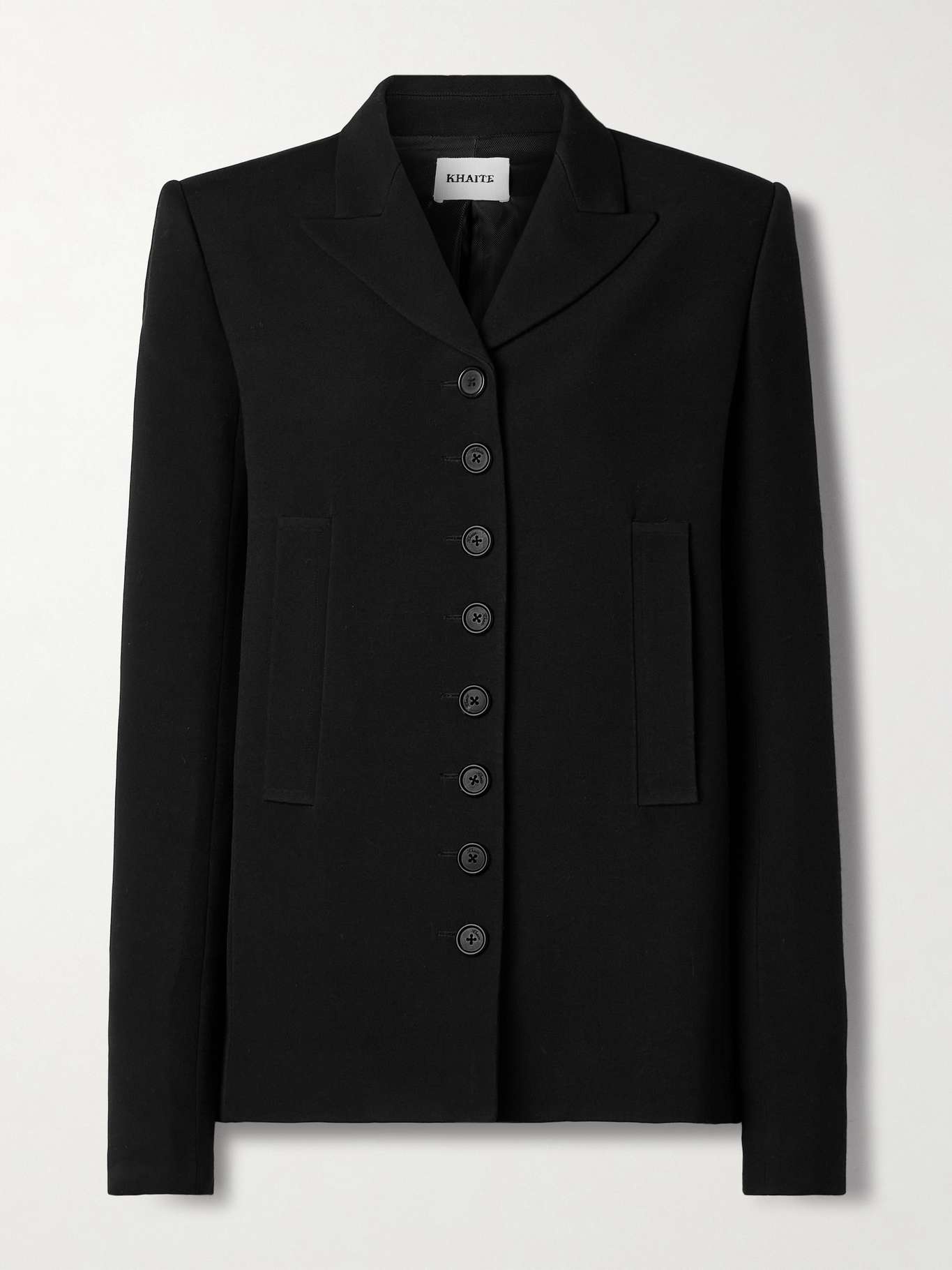 EDITORS'NOTES KHAITE's 'Saraphina' jacket is cut in a slightly loose silhouette with padded shoulders that give it structure. It's tailored from black grain de poudre and detailed with vertical welt pockets, a row of horn buttons and a full satin-twill lining. SIZE & FIT - Fits true to size, however those who are between sizes should take the smaller size - Designed for a slightly loose fit - Internal shoulder pads - Mid-weight, non-stretchy fabric - Model is 175cm/ 5'9" and is wearing a US 4 DETAILS & CARE - Black grain de poudre - Button fastenings through front - 75% viscose, 25% polyamide; buttons: 100% horn