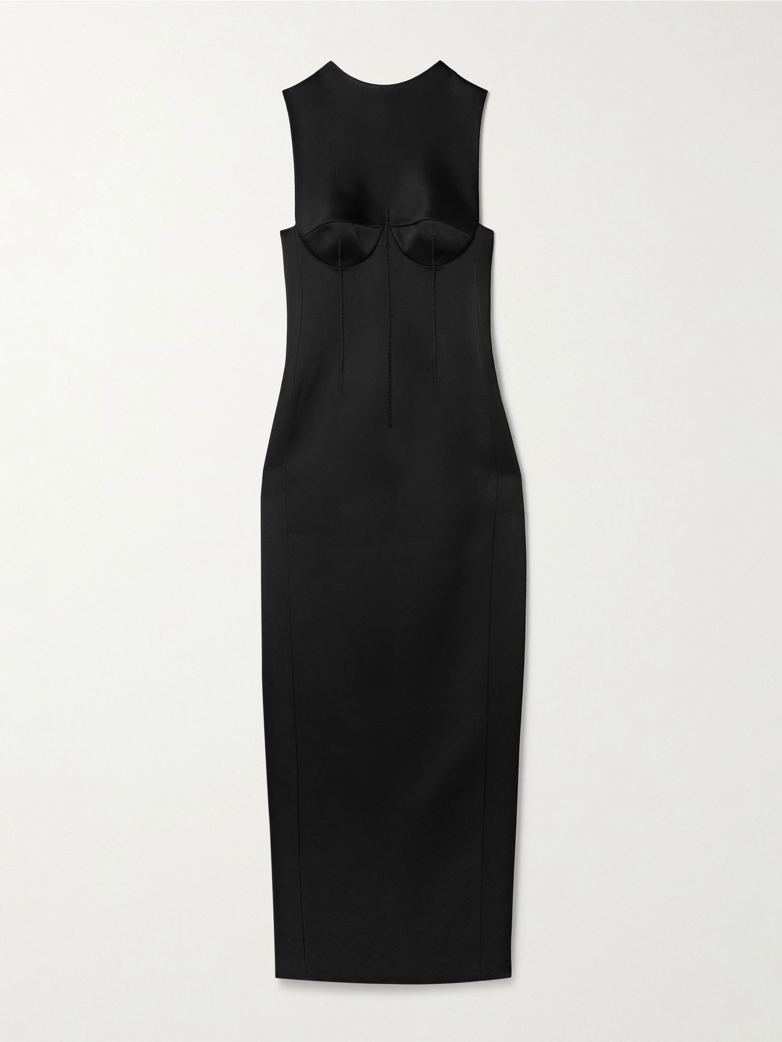 KHAITE's 'Soshana' gown is defined by its molded cups and corset-inspired bodice, complete with boning. It's made from satin-crepe and has a figure-hugging fit and elegant high neck. Details & Care - Black satin-crepe - Concealed hook and zip fastening at back - 83% acetate, 17% viscose; lining: 100% silk