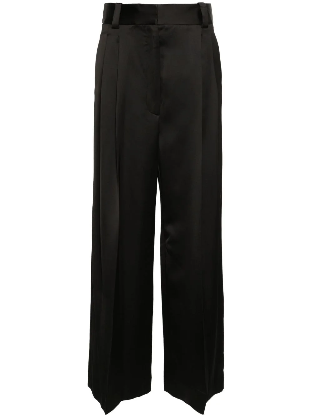 Simone satin trousers Highlights - Black - Satin finish - High waist - Belt loops - Pleat detailing - Two diagonal pockets to the sides - Two rear jetted pockets - Wide leg - Concealed front button, hook and zip fastening Made in United States Composition Outer: Viscose 68%, Virgin Wool 32% Lining: Cupro 100% SIZE & FIT Model measurements Height 5 ft 10 in(1.78 m) Bust/Chest 33.07 in(84 cm) Hips 35.82 in(91 cm) Waist 25.98 in(66 cm) FittingInformation Designed with a wide-leg cut, these trousers allow for a close fit at the waist and offer a loose and roomy fit over the leg Made from a midweight non-stretch fabric This piece fits true to size – take your usual size