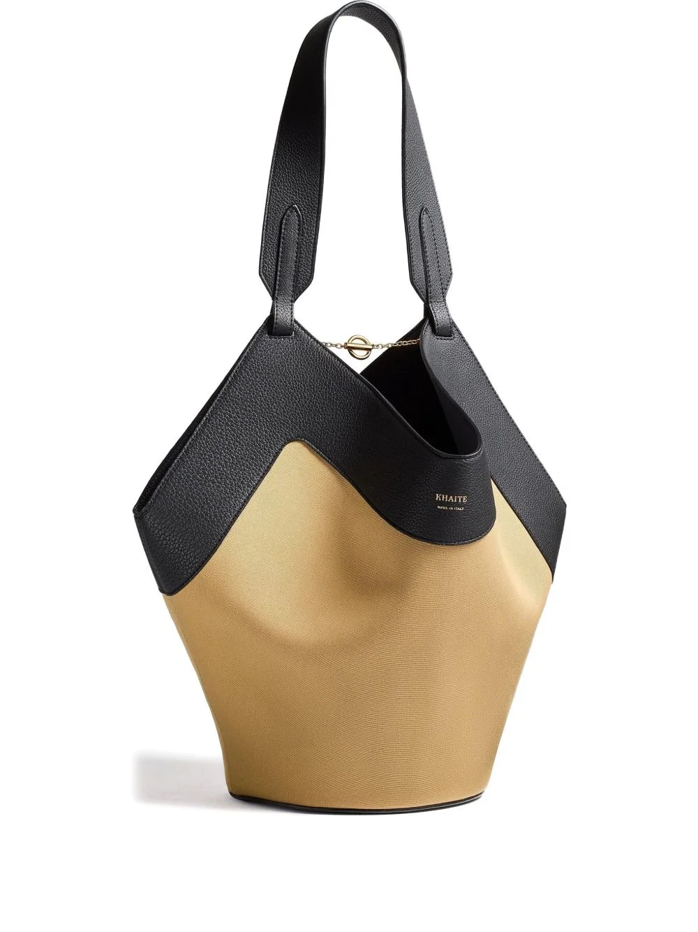 small Lotus leather tote Highlights - Honey - Leather trim - Top handle - Trapezoid shape - Open top Made in Italy Composition Outer: CALFSKIN 100%, Canvas 100% SIZE & FIT Measurement DEPTH 13.97 in(35.5 cm) HANDLE 8.97 in(22.8 cm) HEIGHT 8.5 in(21.6 cm) WIDTH 18.11 in(46 cm) Washing instructions Specialist Cleaning