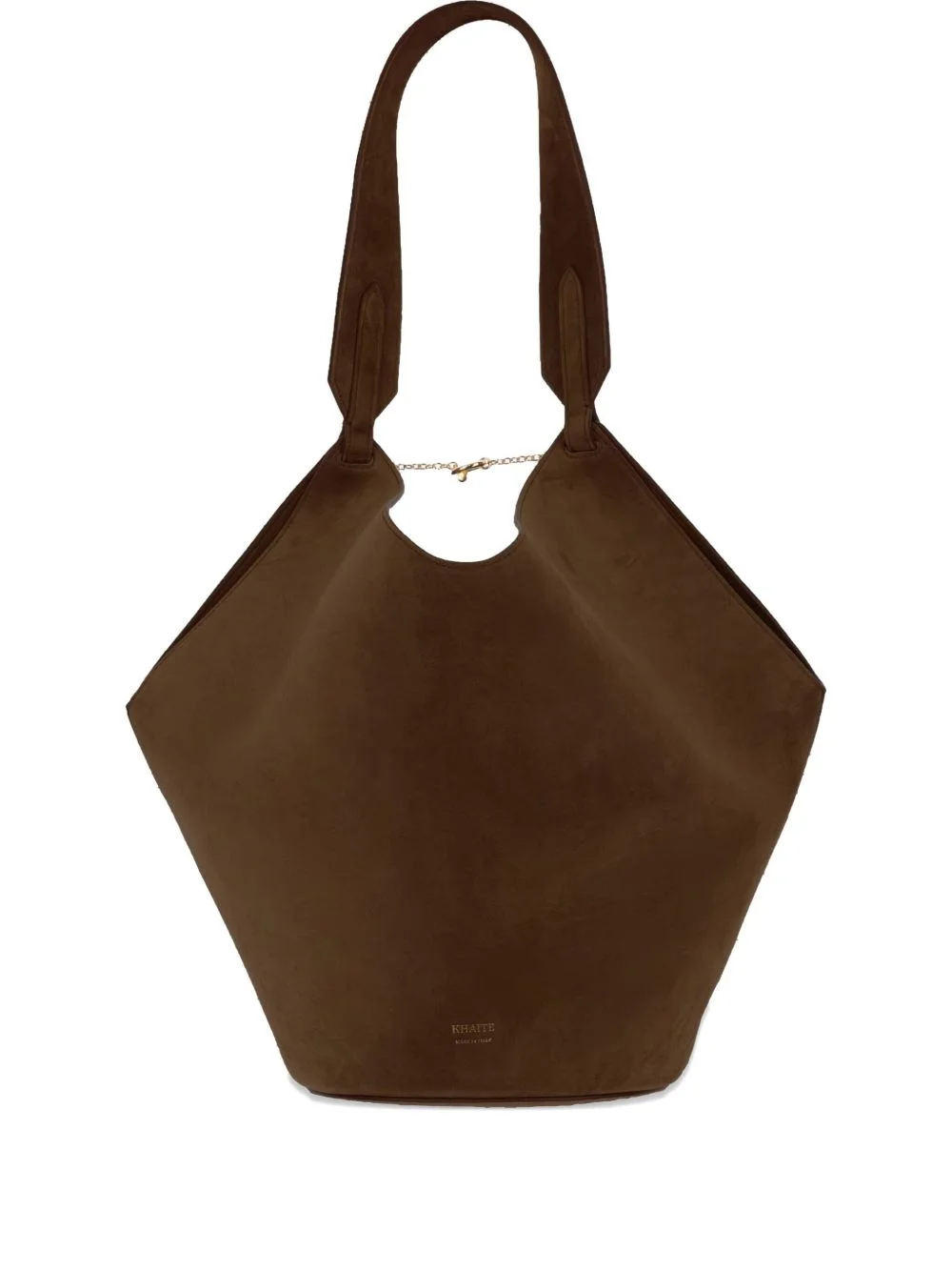 suede shoulder bag Highlights - Dark brown - Calf leather - Top handle - Gold-tone chain detail - Open top Made in Italy Composition Suede 100% SIZE & FIT Measurement DEPTH 13.97 in(35.5 cm) HEIGHT 8.5 in(21.6 cm) STRAP 8.97 in(22.8 cm) WIDTH 18.11 in(46 cm)