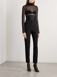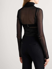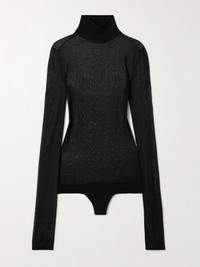 EDITORS'NOTES KHAITE's 'Tallin' bodysuit debuted on the label's Fall '24 runway where it was styled under so many coats and jackets. Made from breathable mesh, it has an elegant turtleneck and a thong jersey base that will go undetectable under tailoring or jeans. SIZE & FIT - Fits true to size, take your normal size - Those with a long torso may wish to take the next size up - Intended for a very close fit - Minimal brief coverage - Lightweight, stretchy fabric - Model is 180cm/ 5'11" and is wearing a size Small DETAILS & CARE - Black mesh - Snap fastenings at base - 72% viscose, 27% polyamide, 1% elastane