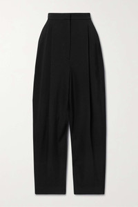 EDITORS'NOTES Khaite has mastered the art of modern tailoring - languid proportions are perfectly balanced by sharp details. Cut from wool-blend twill, these 'Ashford' pants have barrel-shaped legs created by elongated pleats and tapered hems. SIZE & FIT - Fits true to size, however those who are between sizes should take the smaller size - High-rise, cut for a loose fit, tapered at the hem - Mid-weight, non-stretchy fabric - Model is 180cm/ 5’11” and is wearing a US 2 DETAILS & CARE - Black wool-blend twill - Concealed button, hook and zip fastening at front - 77% wool, 23% viscose