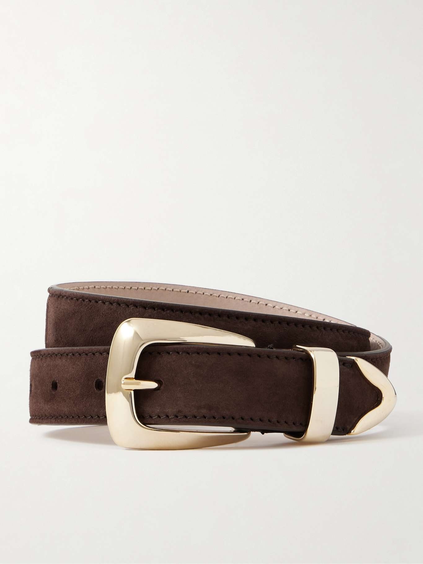 KHAITE's 'Benny' belt will tie together so many outfits. It's made from supple chocolate suede and punctuated with a gold-tone buckle. Don't save it just for jeans and pants - experiment by styling yours over midi dresses and coats. Size & Fit - PS/S = sizes 70-80 - M/L = sizes 80-90 - Designed to be worn on the hips or waist - Measurements can be found in the link below Details & Care - Chocolate suede (Calf) - Buckle fastening
