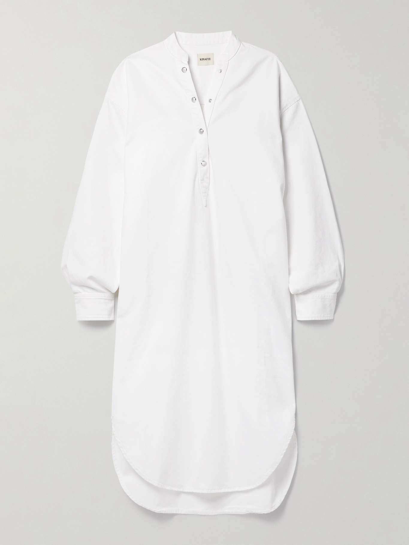 EDITORS'NOTES The contemporary cuts of Khaite's designs are part of what makes them so desirable. This 'Seffi' shirt dress is made from white denim for an oversized fit enhanced by dropped shoulder seams and splits along the curved hem. Adjust the snap fastenings at the neckline to create more or less coverage. SIZE & FIT - Fits true to size, take your normal size - Intended for an oversized fit, cut to be worn very loose - Mid-weight, non-stretchy fabric - Model is 180cm/ 5’11” and is wearing a US 4 DETAILS & CARE - White denim - Snap fastenings along front - 80% cotton, 20% recycled cotton
