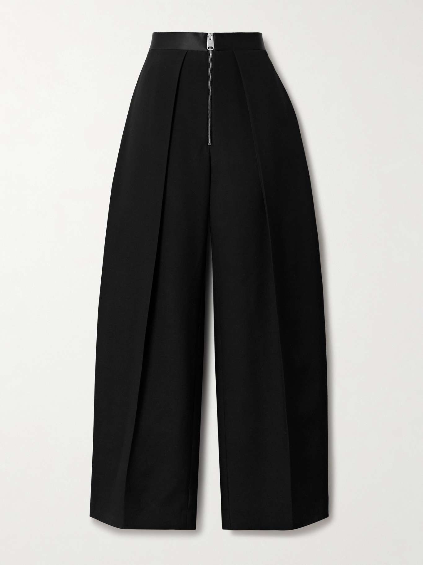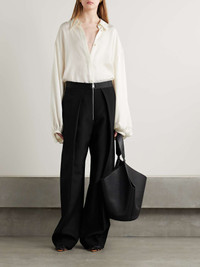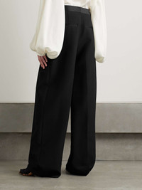 EDITORS'NOTES KHAITE's 'Marine' pants have a tuxedo-inspired satin-trimmed mid-rise waistband that instantly sets them apart. They're made from crepe and have sharp pleats that trace the entire length of the straight legs. SIZE & FIT - Fits true to size, however those who are between sizes should take the smaller size - Mid-rise, cut for a straight-leg fit - Mid-weight, slightly stretchy fabric - Model is 177cm/ 5'10" and is wearing a US 2 DETAILS & CARE - Black crepe and satin - Zip fastening along front - 75% viscose, 25% polyamide