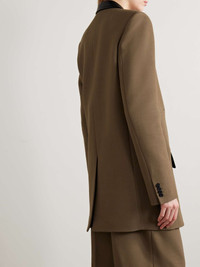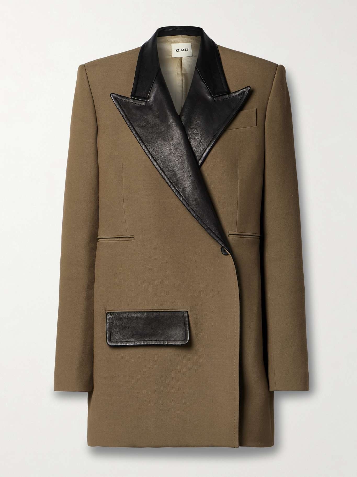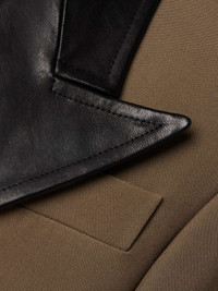 EDITORS'NOTES The tailoring throughout Khaite's Spring '24 collection feels particularly sharp, especially in contrast to the many fluidly draped designs. This crepe 'Jacobson' blazer has black leather trims highlighting the dramatic peak lapels and a single flap pocket. The padded shoulders give the longline shape nice structure. SIZE & FIT - Fits true to size, take your normal size - Designed for a loose fit - Internal shoulder pads - Mid-weight, slightly stretchy fabric - Model is 180cm/ 5’11” and is wearing a US 4 DETAILS & CARE - Brown crepe, black leather - Button fastenings through front - 75% viscose, 25% polyamide - Designer color: Toffee
