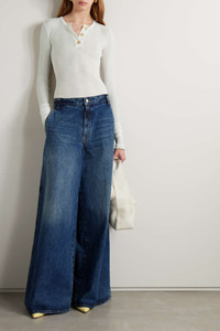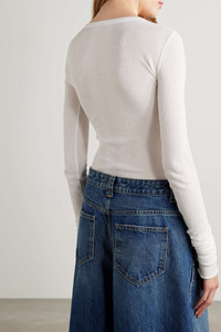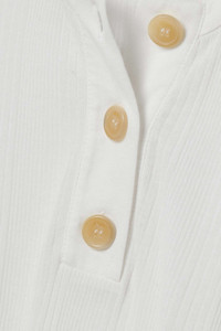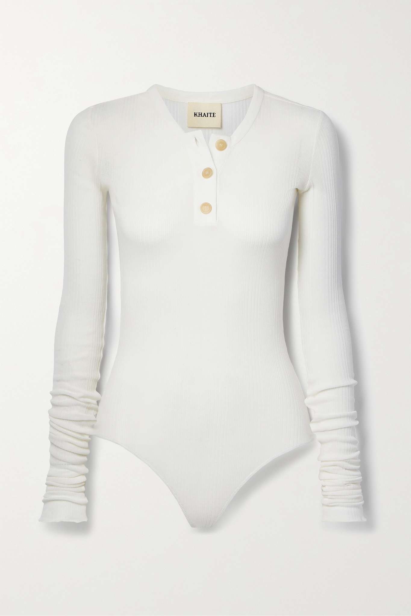 Khaite's timeless pieces will become staples in your wardrobe. Made from ribbed cotton-blend, this slightly sheer 'Janelle' bodysuit has a Henley neckline and extra long sleeves that can be scrunched up at the wrist. Size & Fit - Fits true to size, take your normal size - Those with a long torso may wish to take the next size up - Designed for a close fit - Minimal brief coverage - Lightweight knit - Model is 180cm/ 5’11” and is wearing a size Small Details & Care - White cotton-blend - Button fastenings along front, snap fastenings at base - 84% cotton, 16% polyamide; buttons: 100% horn (Buffalo)