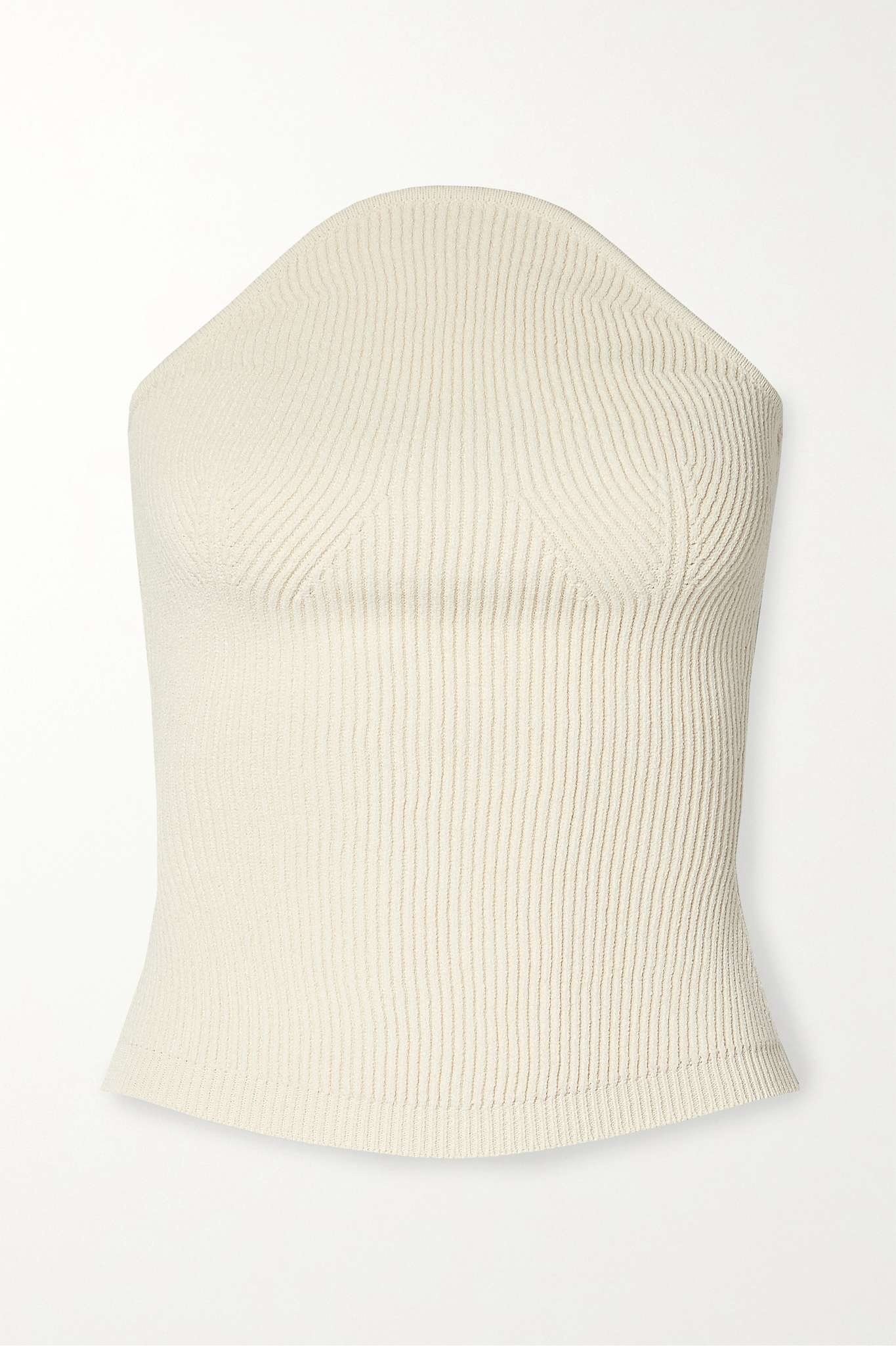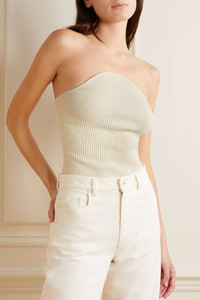 EDITORS'NOTES Khaite's 'Jericho' top is made from a thick ribbed-knit that provides structure without the need for boning or underwire. Designed for a figure-hugging fit, it has a strapless, convex neckline and contouring darts along the cups. Style yours with leather pants or use it to underpin tailoring. SIZE & FIT - Fits true to size, take your normal size - Those with a large bust may wish to take the next size up - Designed for a very close fit - Mid-weight knit - Model is 180cm/ 5’11” and is wearing a size Small DETAILS & CARE - Ivory ribbed-knit - Slips on - 83% viscose, 17% polyester - Dry clean